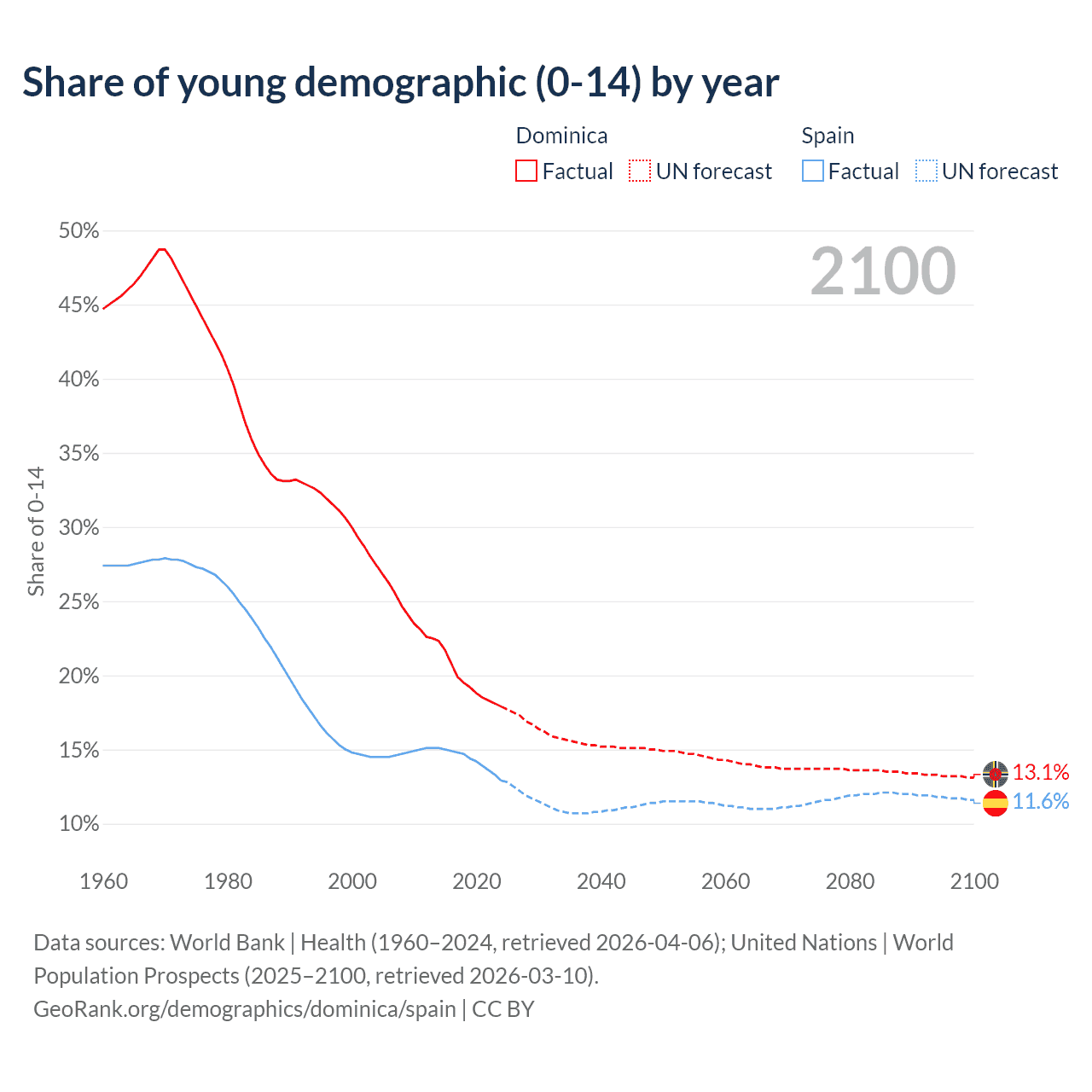 - The share of young demographic (0-15 years old) in Dominica is 17.9% vs 12.9% in Spain.