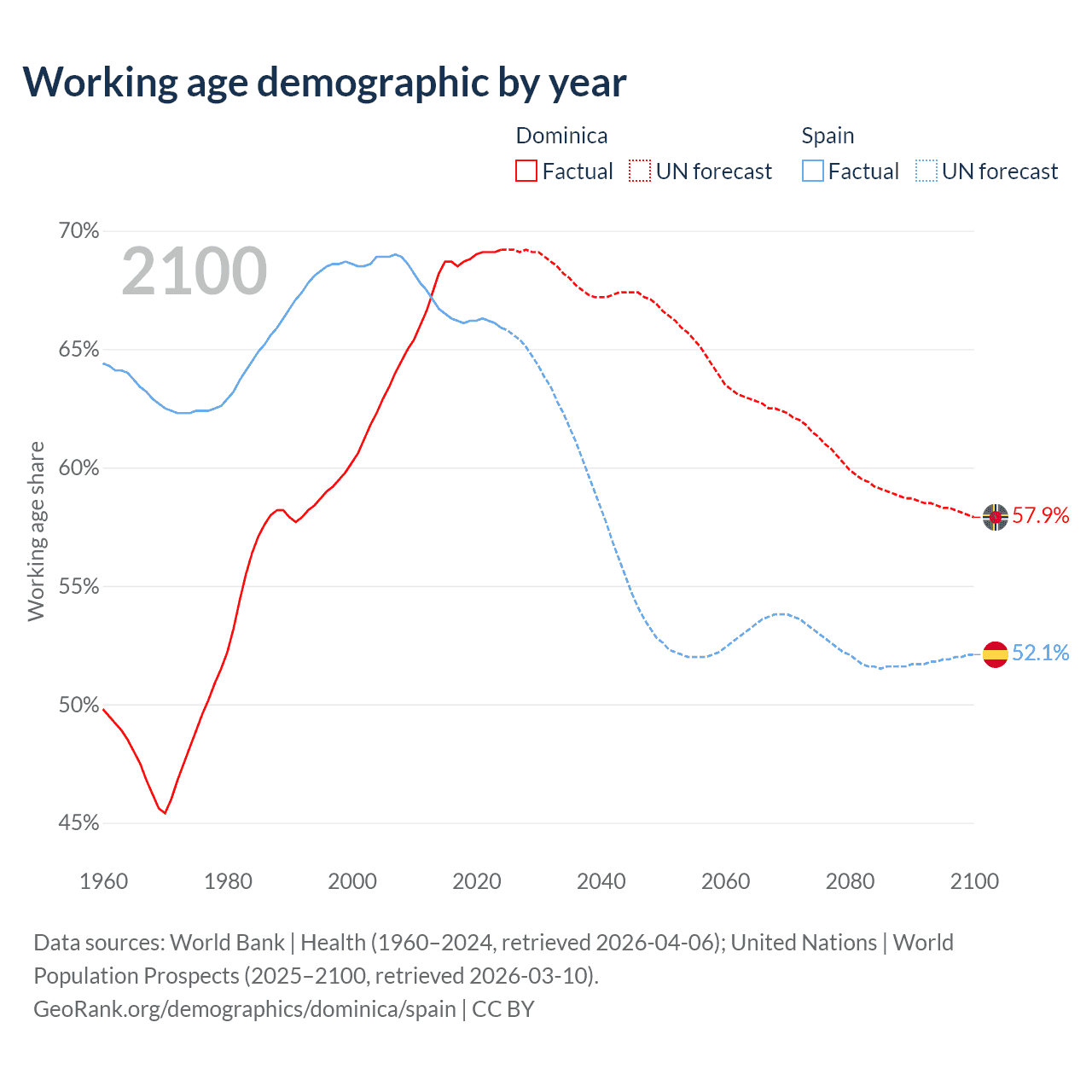 - Dominica has 45.3K working age adults (aged 15-64) vs 32.2M in Spain.