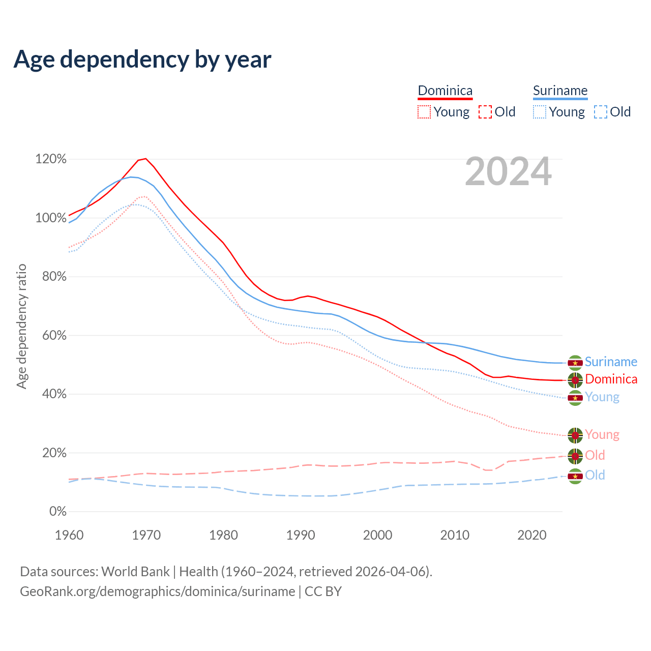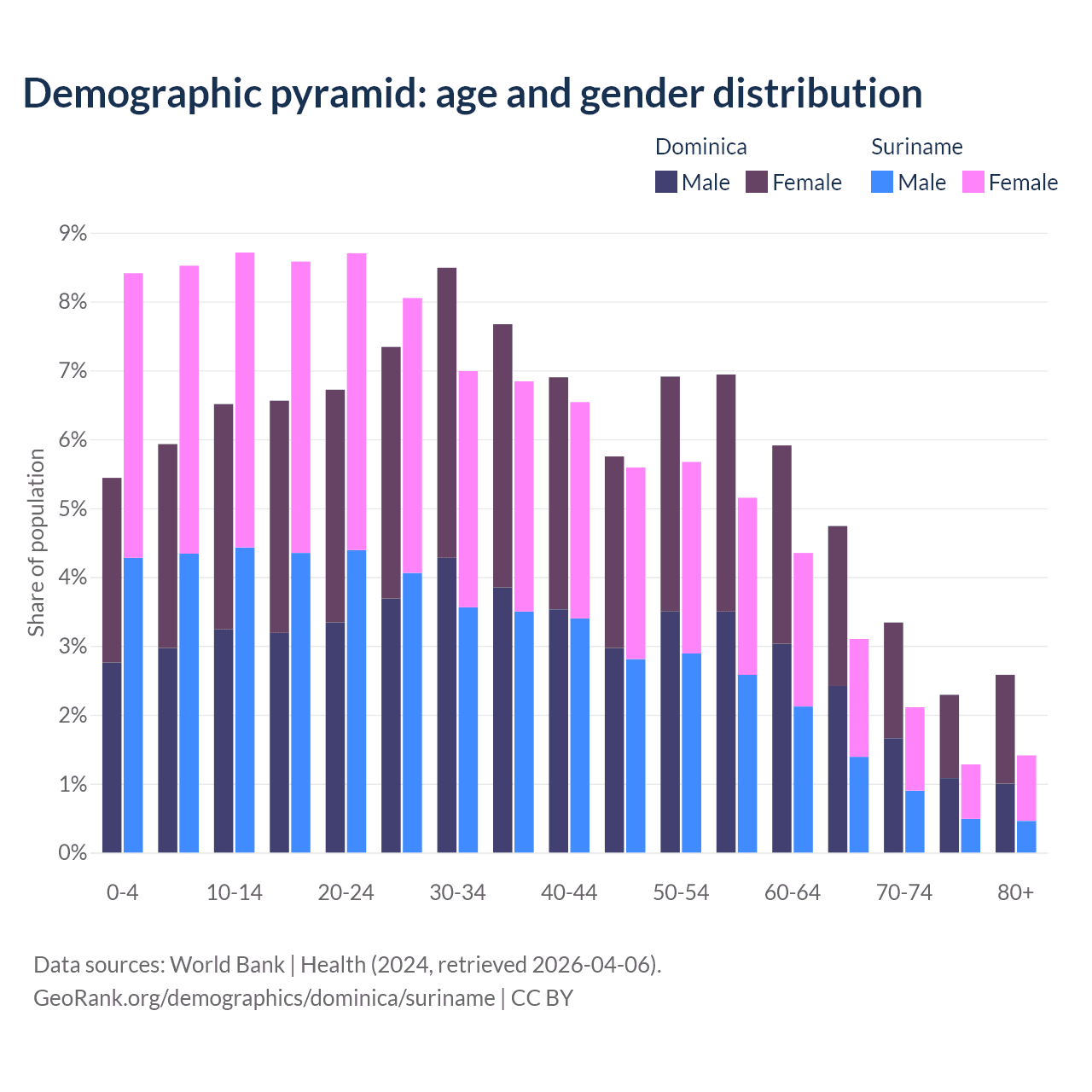 - Dominica is ranked 66/196 by median age (oldest to youngest) vs 109/196 for Suriname.