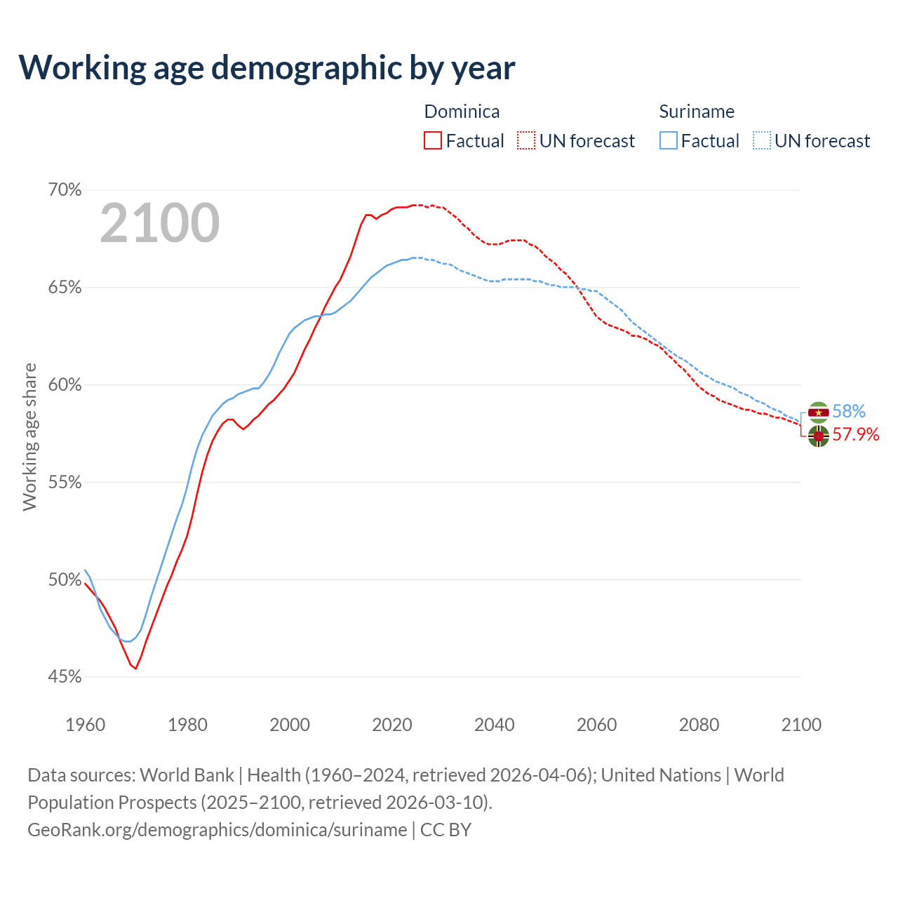 - Dominica has 45.3K working age adults (aged 15-64) vs 430K in Suriname.