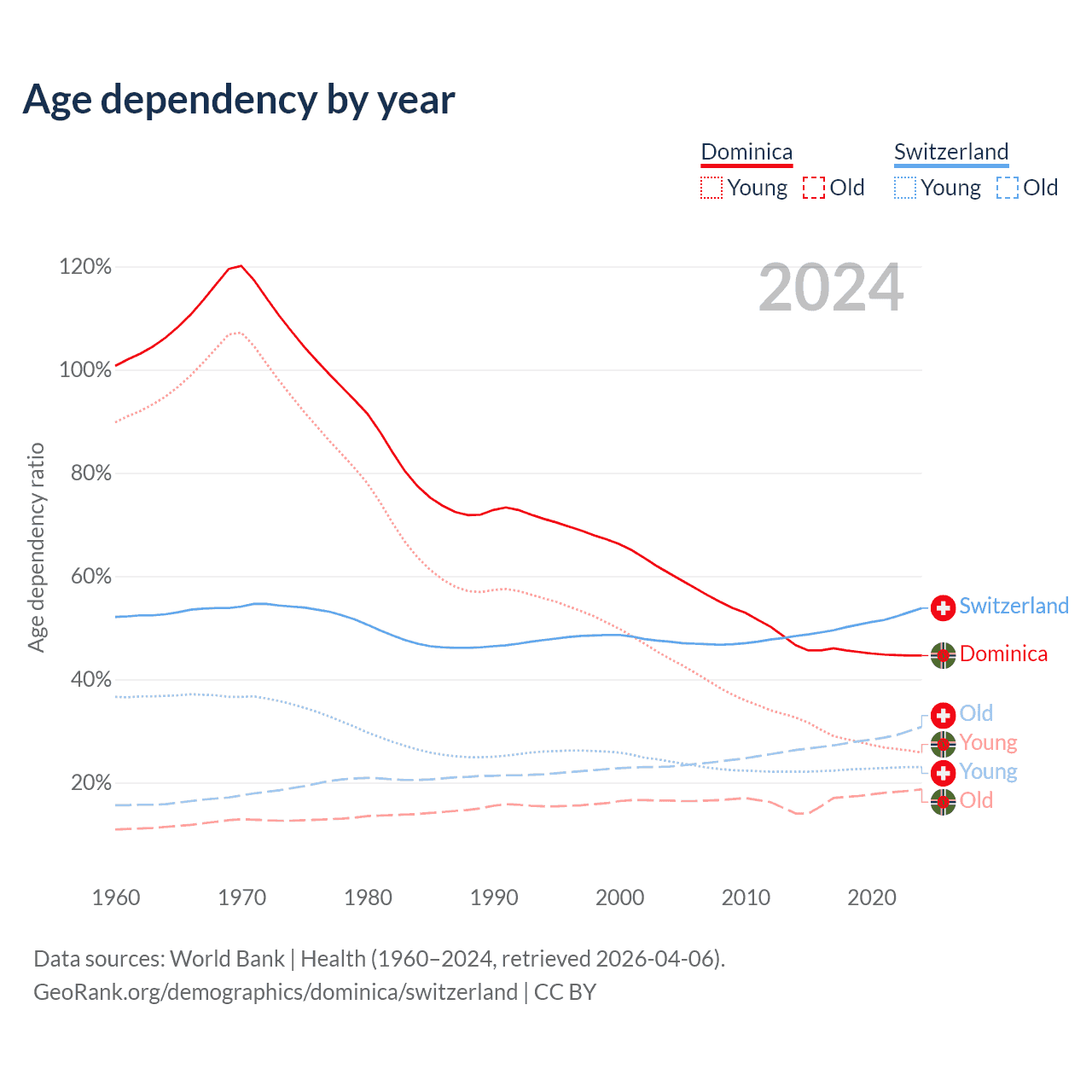 The share of older people aged 65 and over is 13% in Dominica and 20% in Switzerland. Life expectancy in Dominica compared to Switzerland .