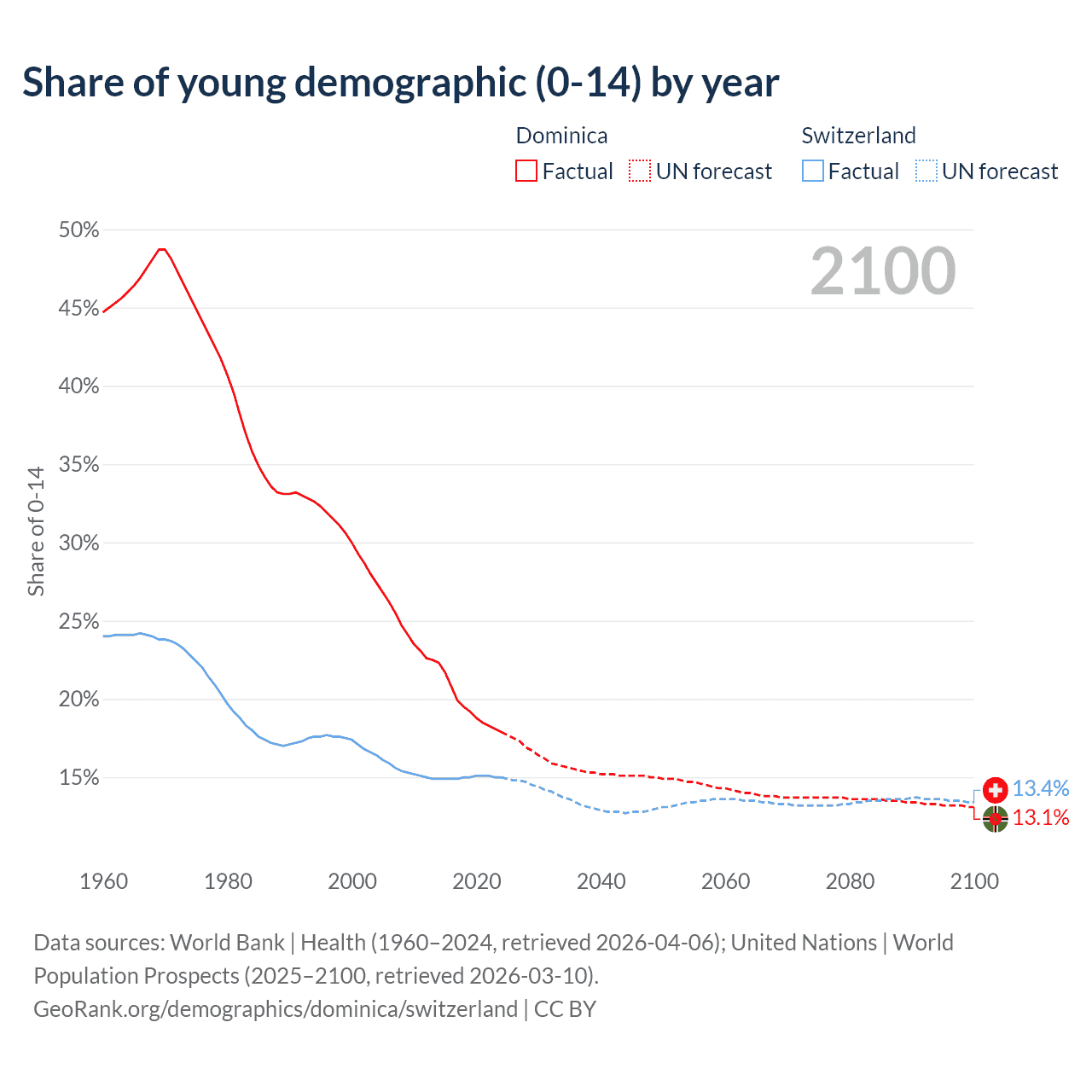 - The share of young demographic (0-15 years old) in Dominica is 17.9% vs 15% in Switzerland.