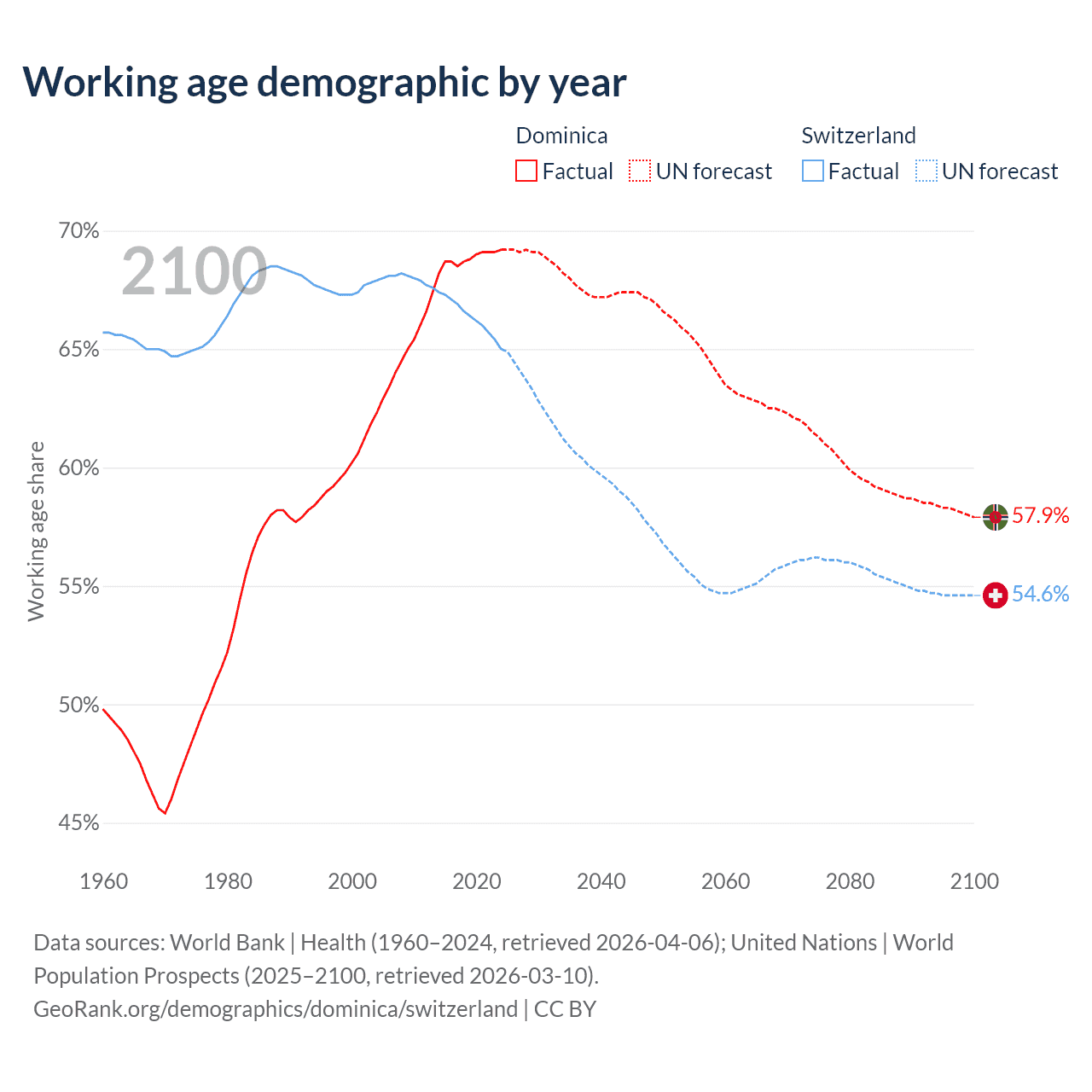 - Dominica has 45.3K working age adults (aged 15-64) vs 5.92M in Switzerland.