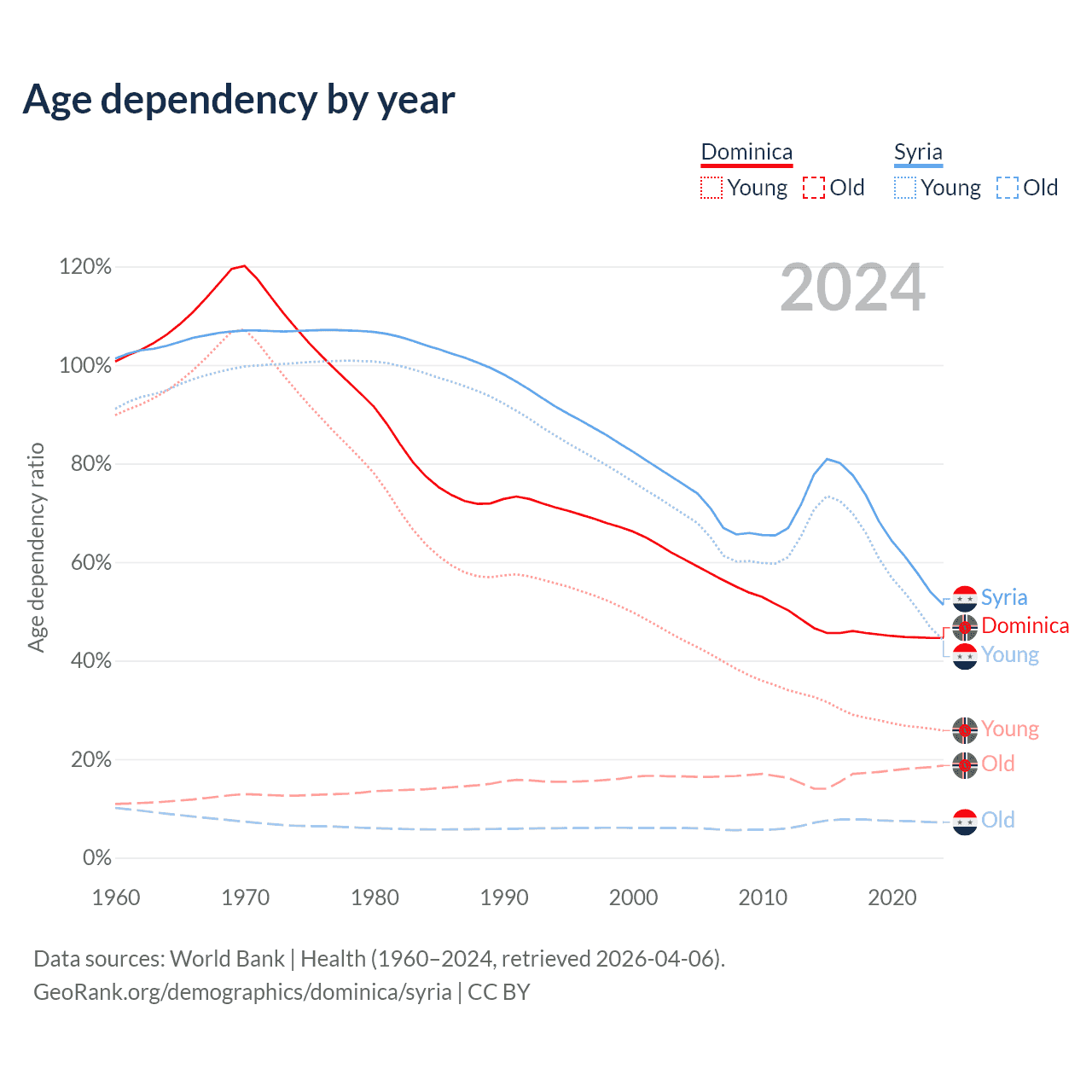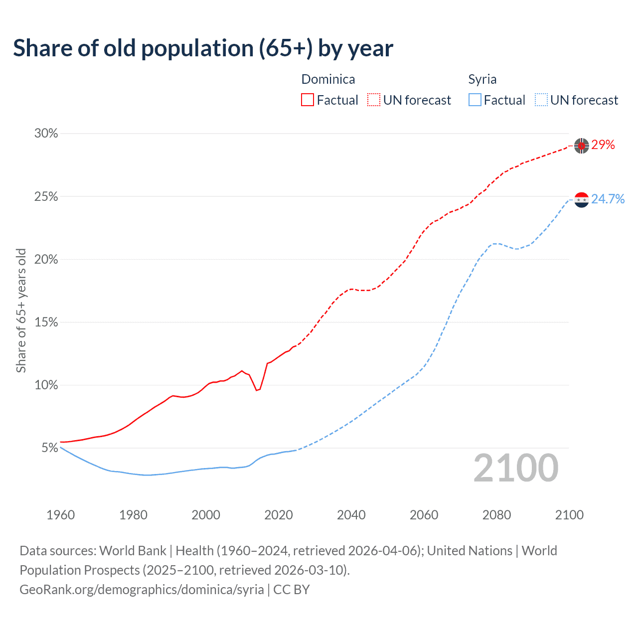- The share of old-age demographic (65+) in Dominica is 13% vs 4.74% in Syria.