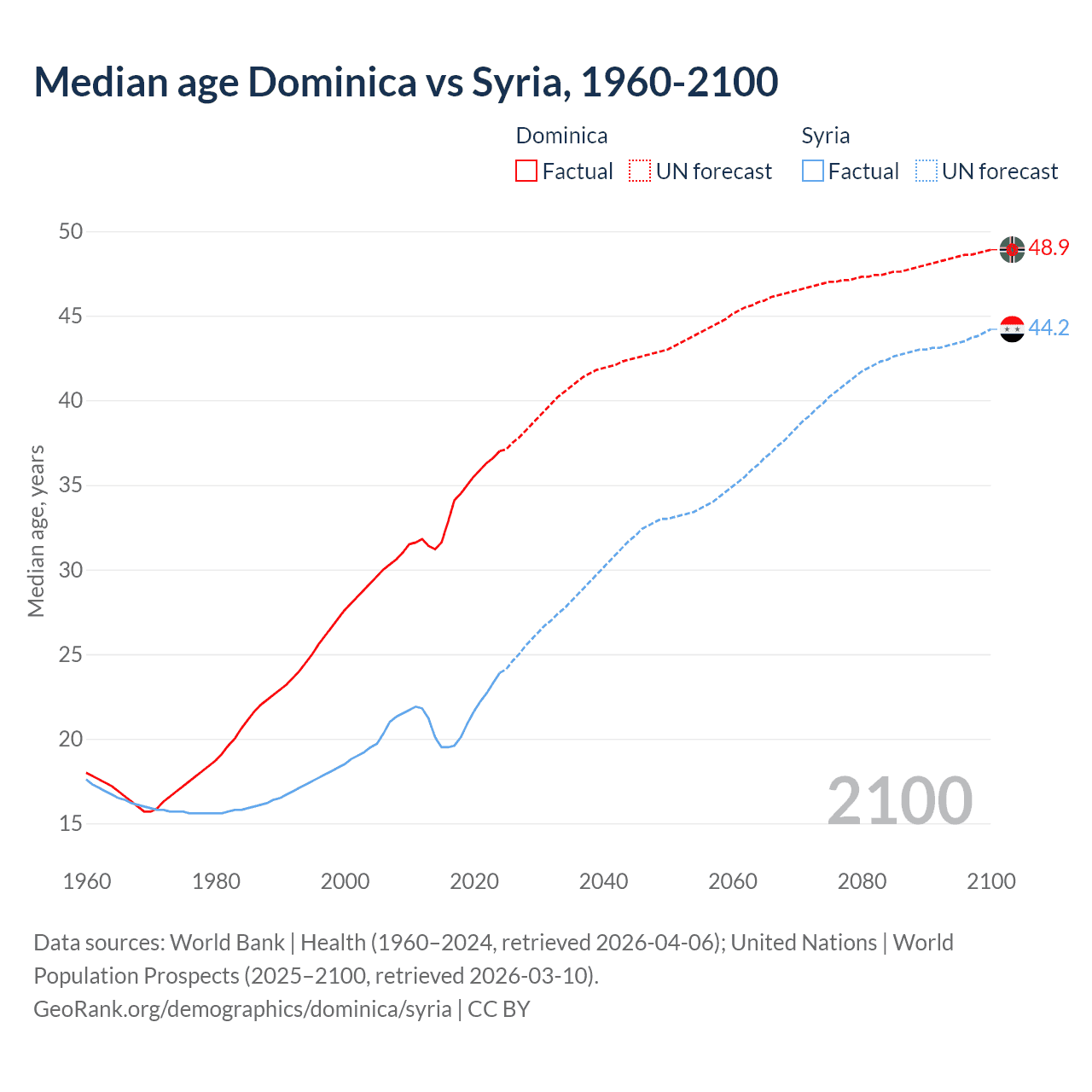 Median age Dominica vs Syria, 1960-2100
