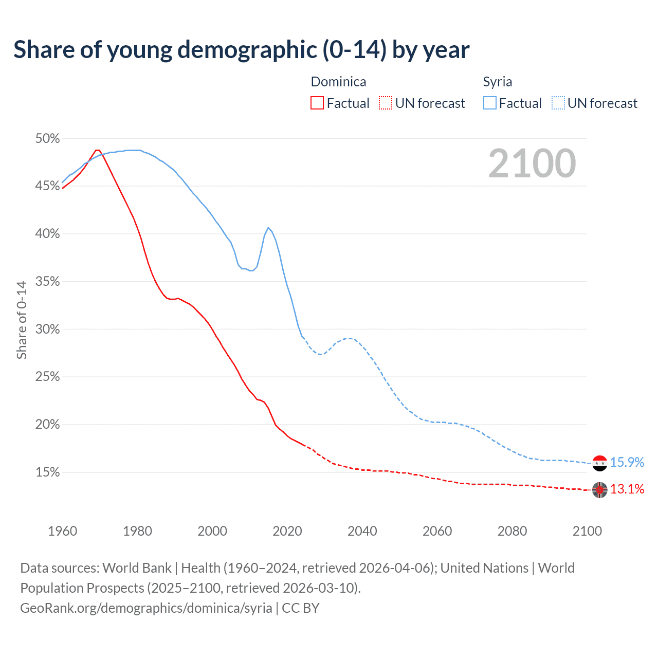 - The share of young demographic (0-15 years old) in Dominica is 17.9% vs 29.2% in Syria.