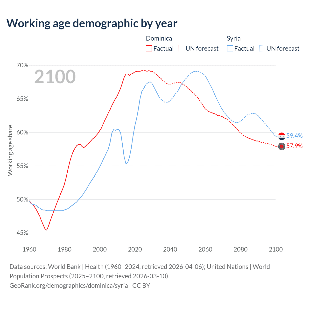 - Dominica has 45.3K working age adults (aged 15-64) vs 17.7M in Syria.