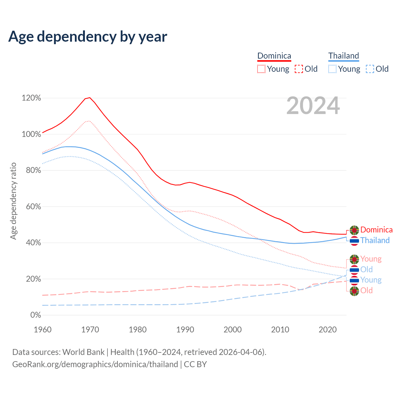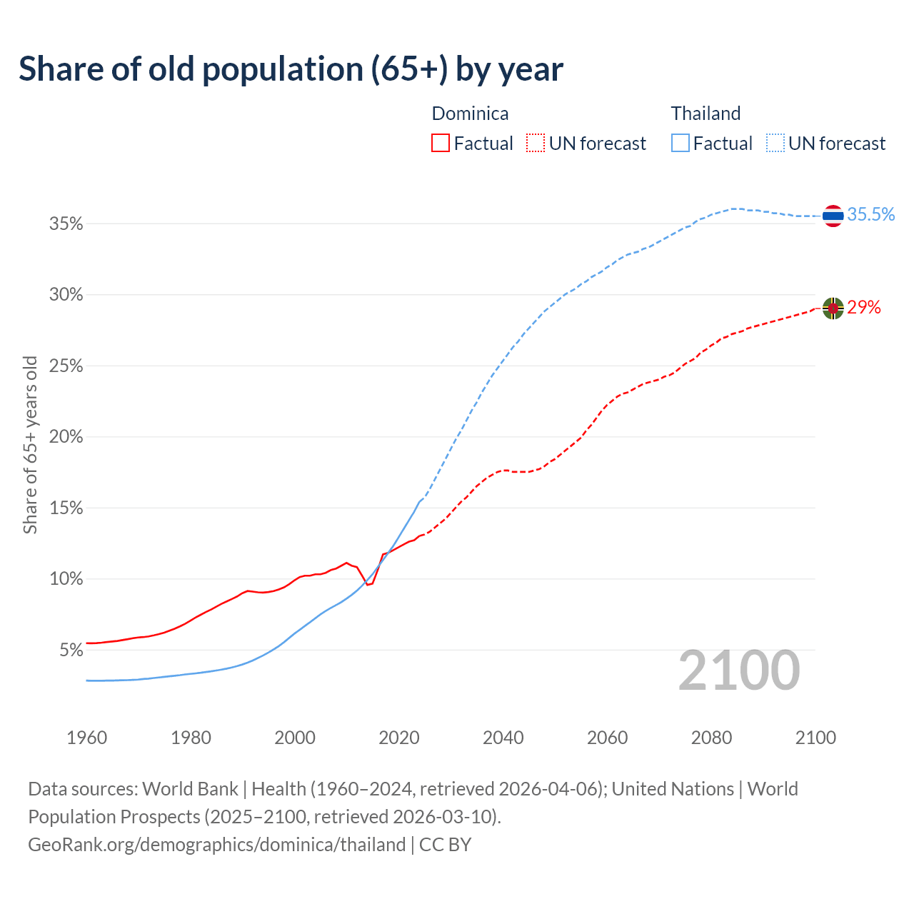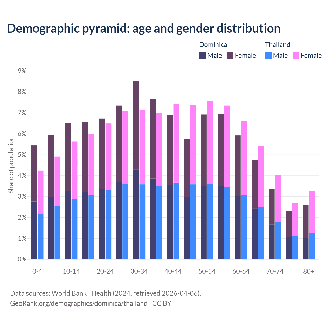 - Dominica is ranked 66/196 by median age (oldest to youngest) vs 40/196 for Thailand.