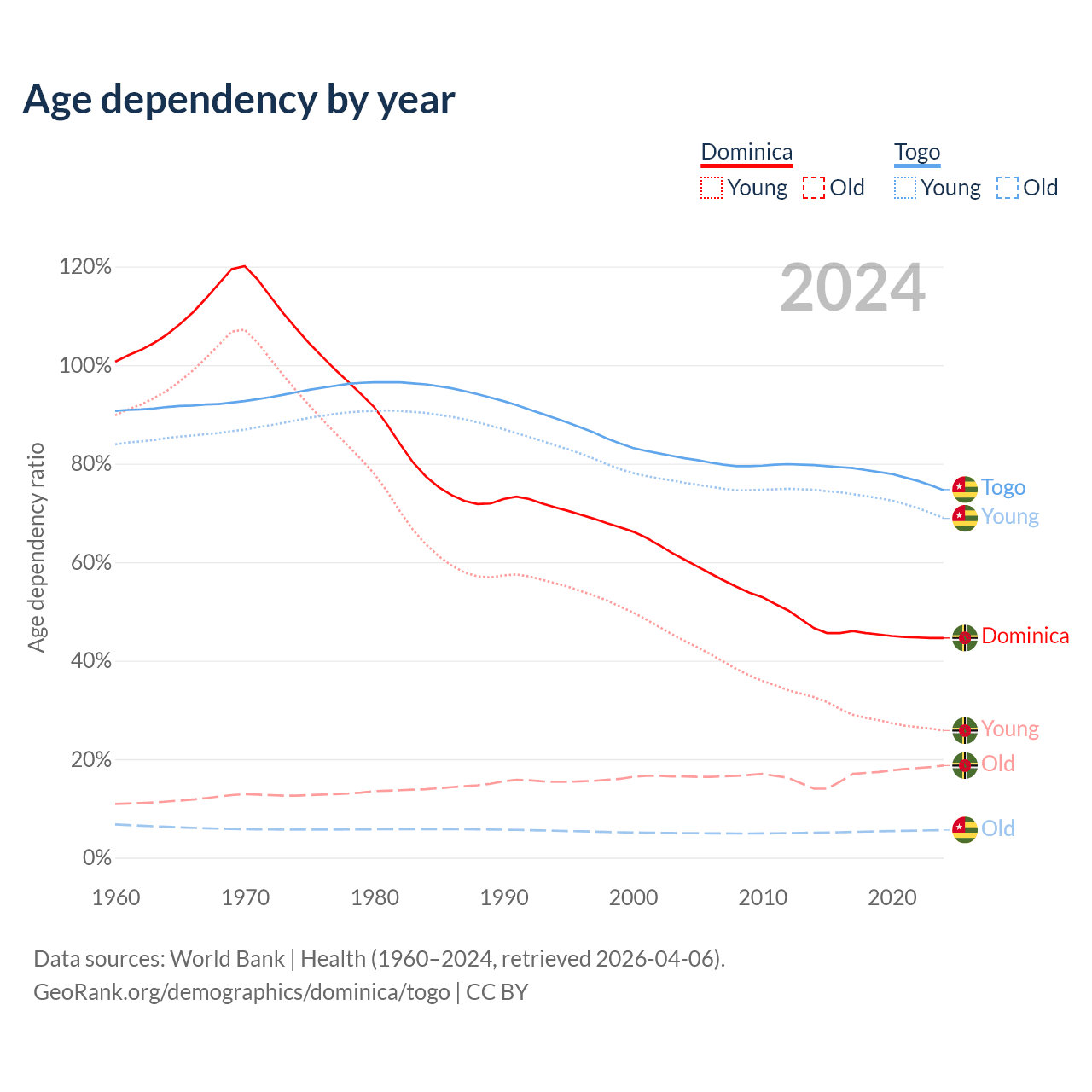 - The share of old-age demographic (65+) in Dominica is 13% vs 3.21% in Togo.