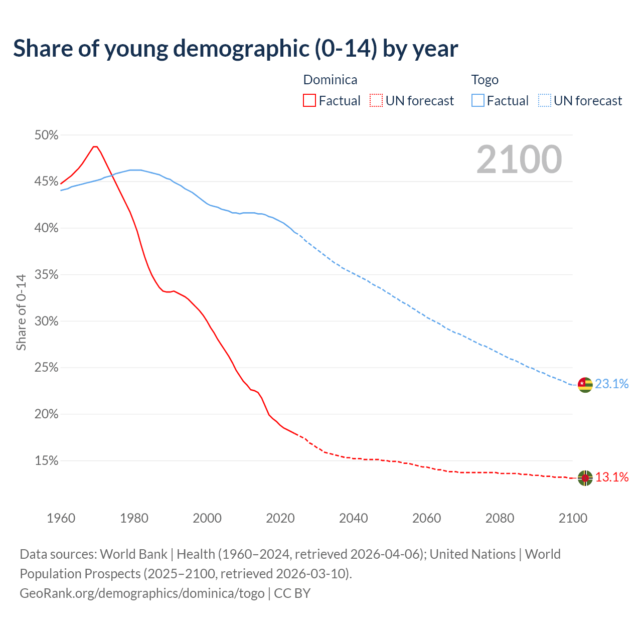 - The share of young demographic (0-15 years old) in Dominica is 17.9% vs 39.5% in Togo.