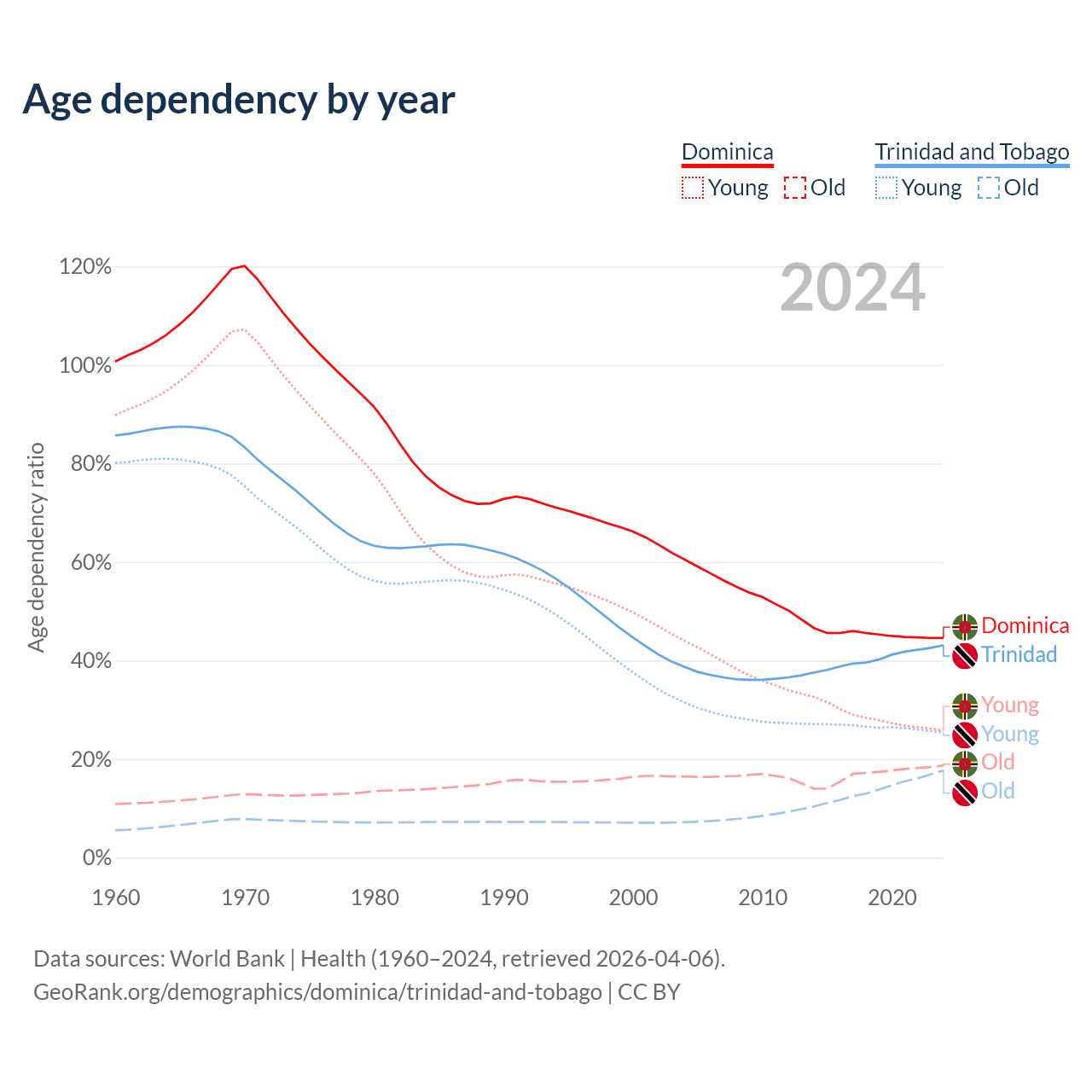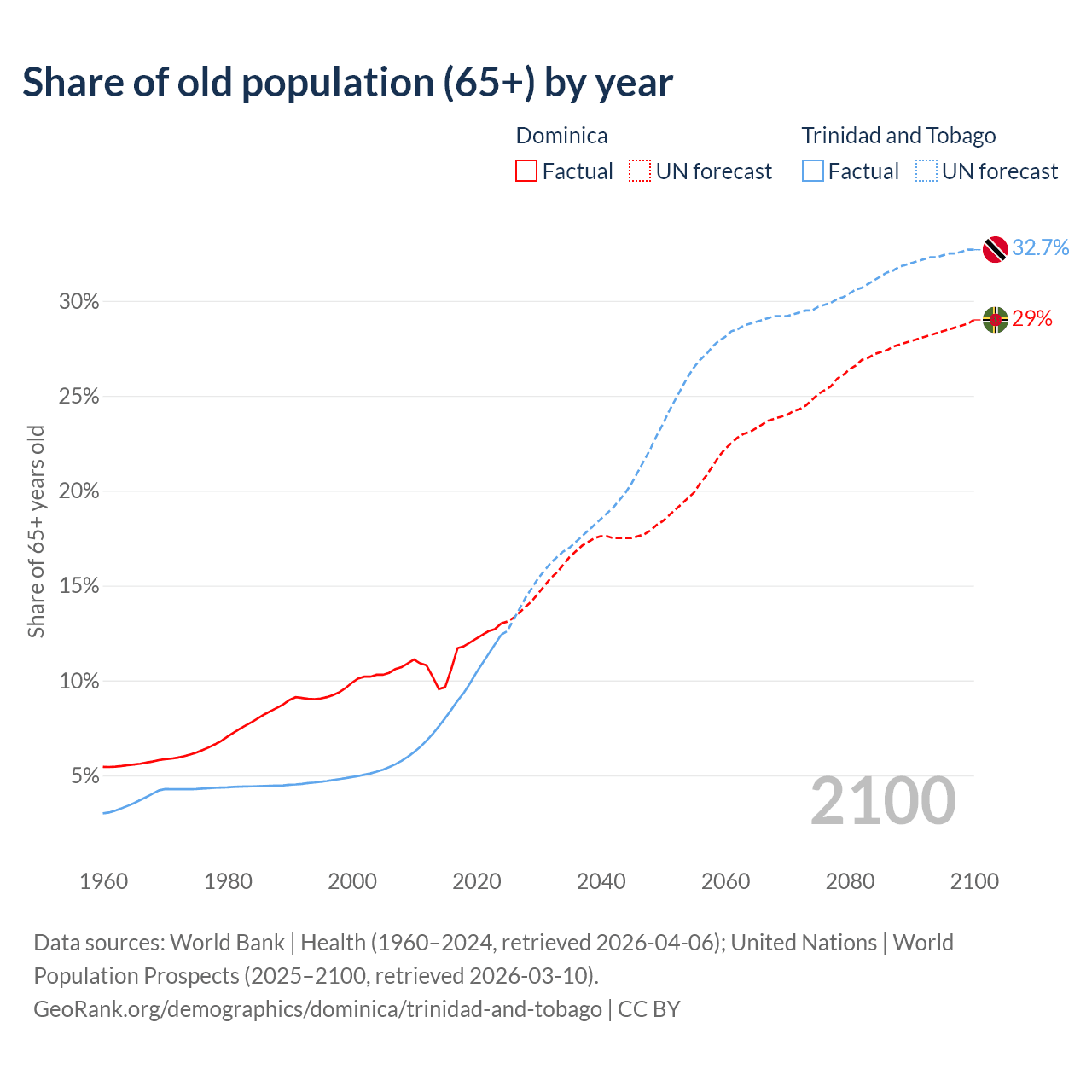 The share of older people aged 65 and over is 13% in Dominica and 12.4% in Trinidad and Tobago. Life expectancy in Dominica compared to Trinidad and Tobago .