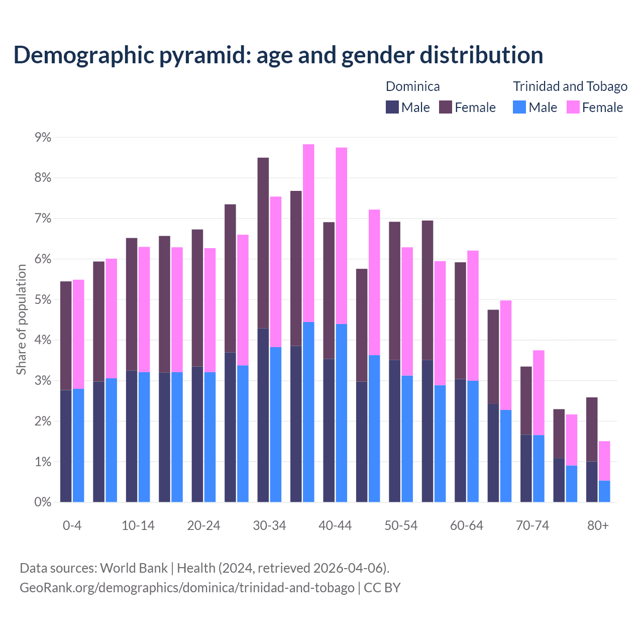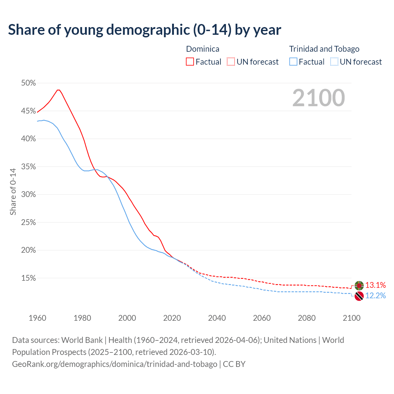 - The share of young demographic (0-15 years old) in Dominica is 17.9% vs 17.8% in Trinidad and Tobago.