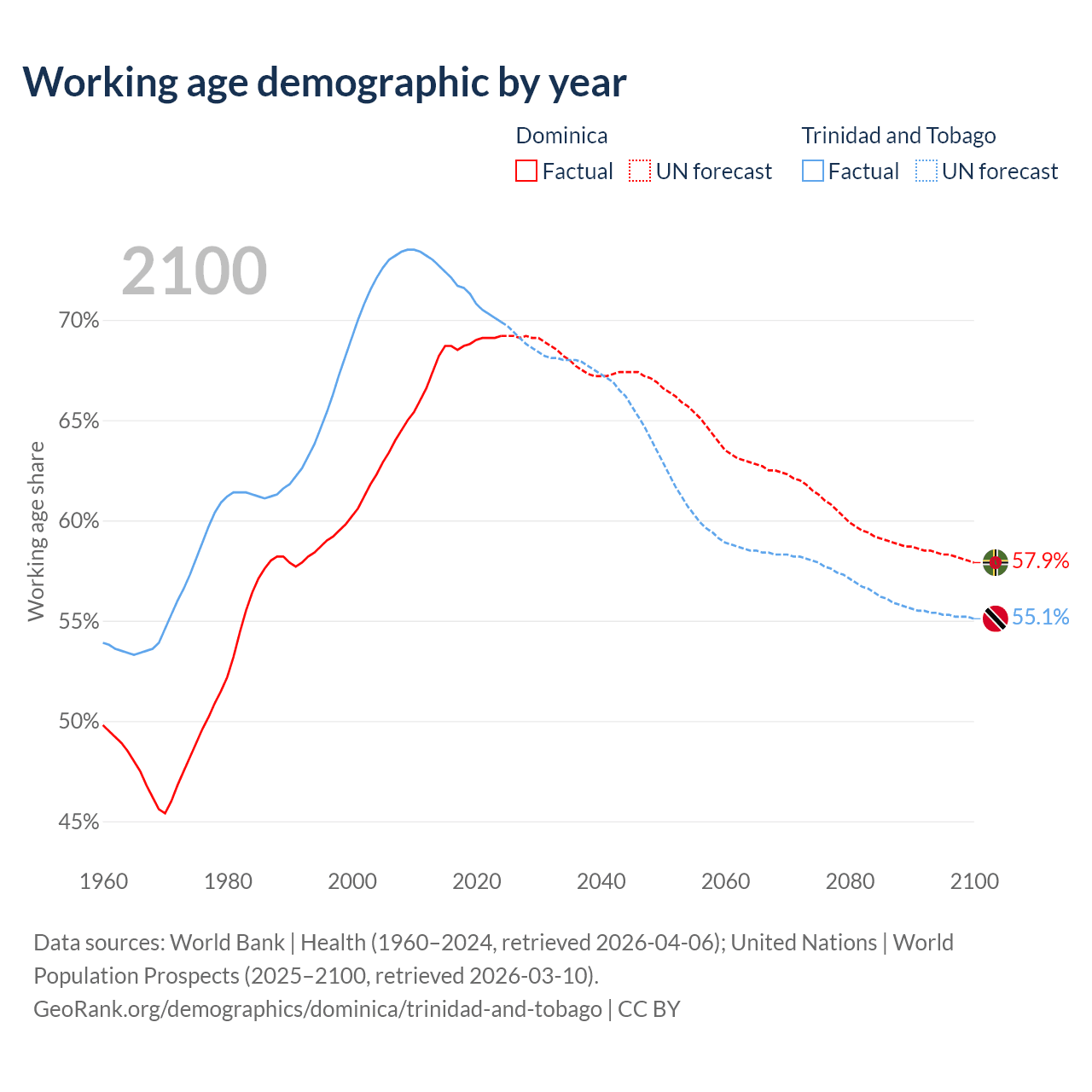 - Dominica has 45.3K working age adults (aged 15-64) vs 960K in Trinidad and Tobago.