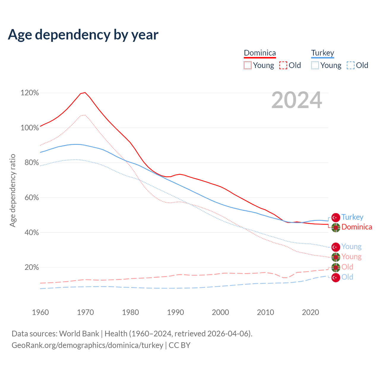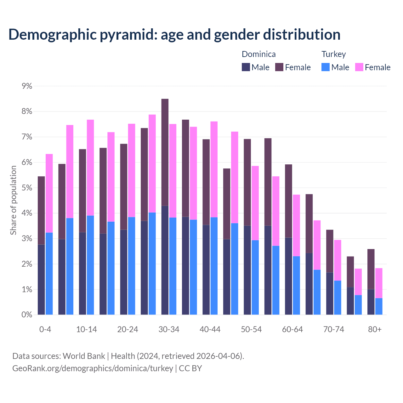 - Dominica is ranked 66/196 by median age (oldest to youngest) vs 83/196 for Turkey.