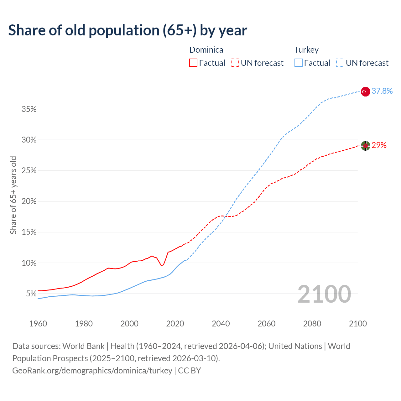 The share of older people aged 65 and over is 13% in Dominica and 10.3% in Turkey. Life expectancy in Dominica compared to Turkey .