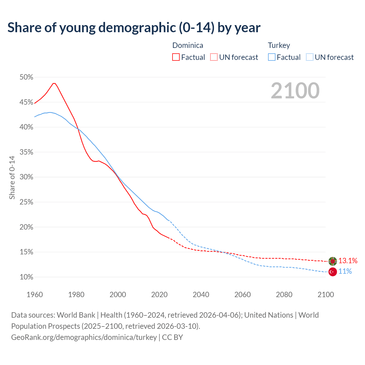 - The share of young demographic (0-15 years old) in Dominica is 17.9% vs 21.4% in Turkey.