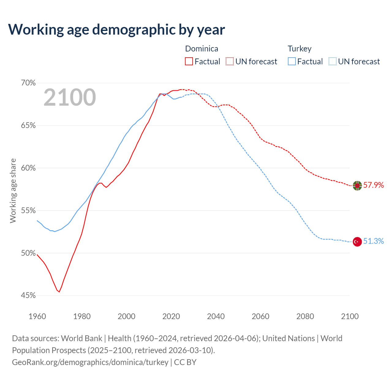 - Dominica has 45.3K working age adults (aged 15-64) vs 58.7M in Turkey.