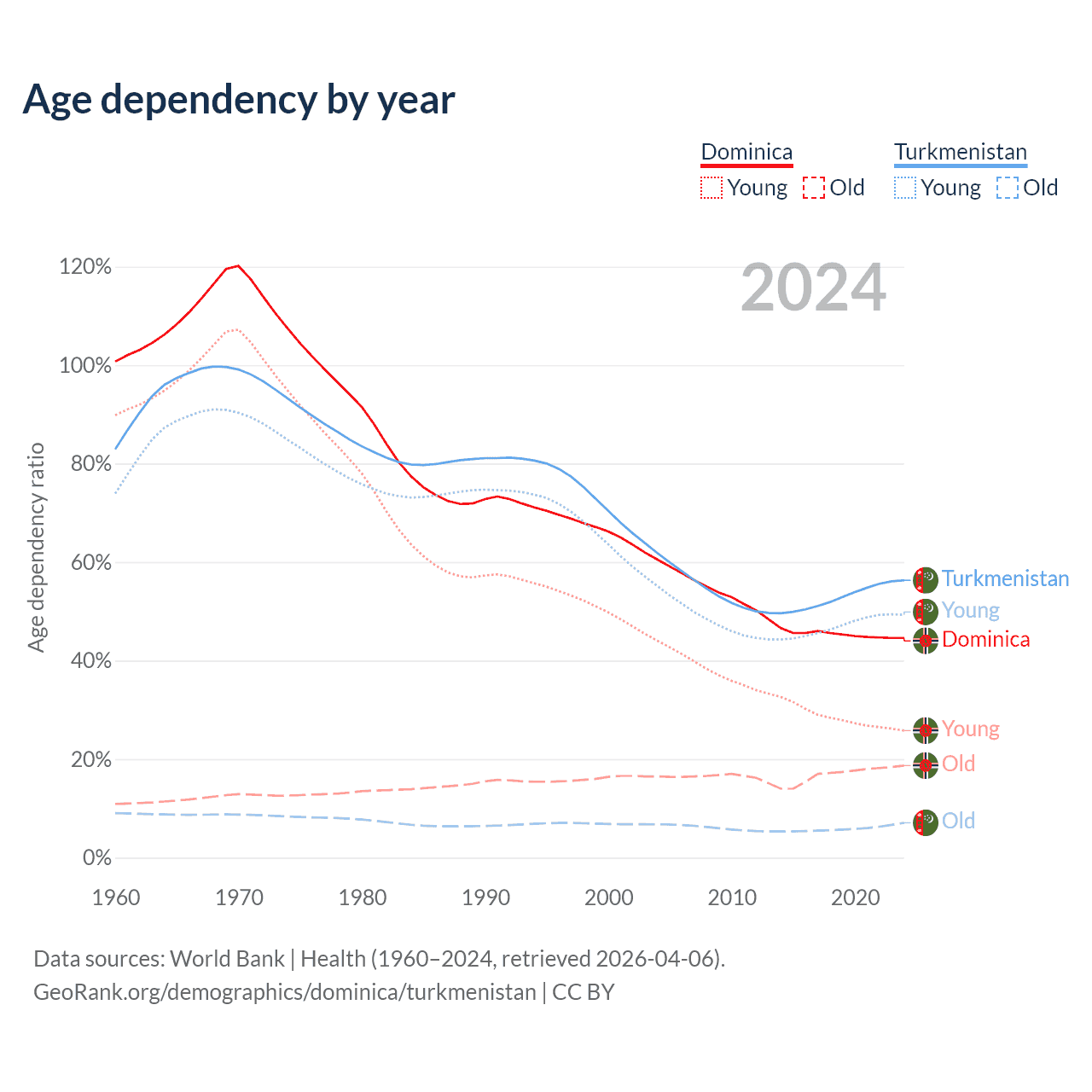 - Dominica is ranked 66/196 by median age (oldest to youngest) vs 119/196 for Turkmenistan.