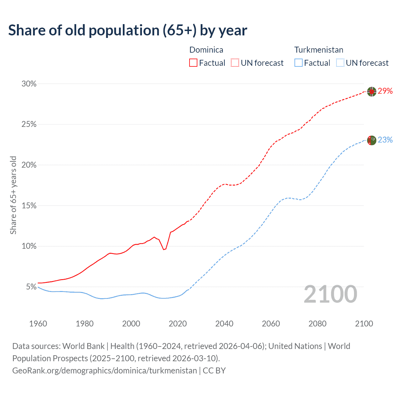 The share of older people aged 65 and over is 13% in Dominica and 4.53% in Turkmenistan. Life expectancy in Dominica compared to Turkmenistan .