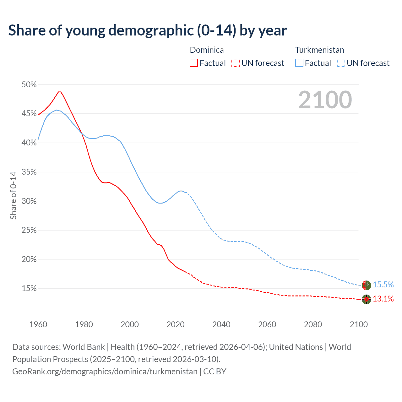 - The share of young demographic (0-15 years old) in Dominica is 17.9% vs 31.5% in Turkmenistan.