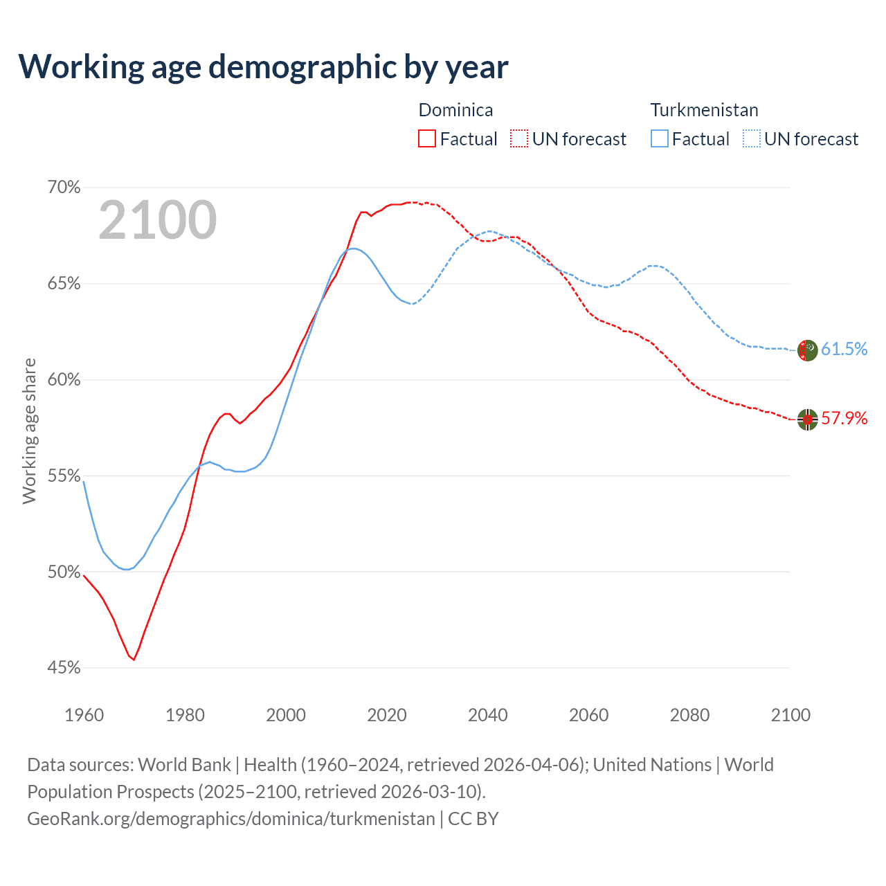 - Dominica has 45.3K working age adults (aged 15-64) vs 4.97M in Turkmenistan.