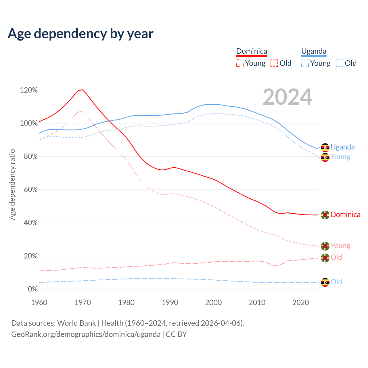 - Dominica is ranked 66/196 by median age (oldest to youngest) vs 187/196 for Uganda.