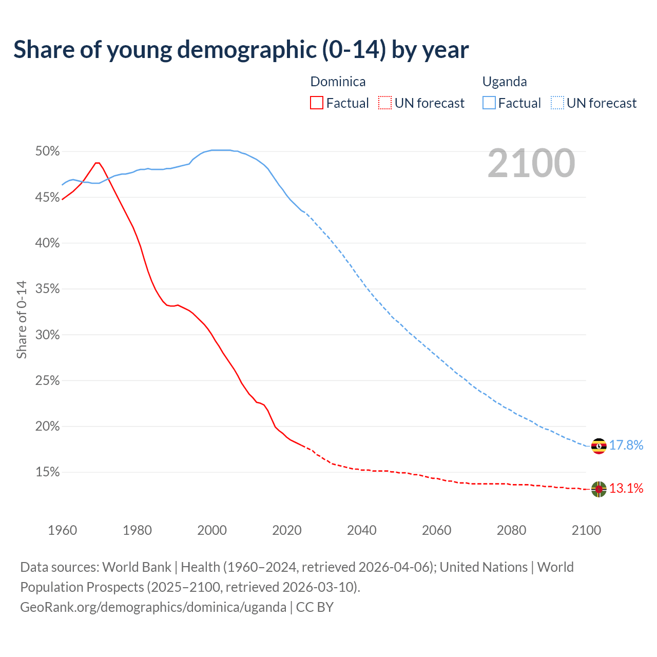 - The share of young demographic (0-15 years old) in Dominica is 17.9% vs 43.5% in Uganda.