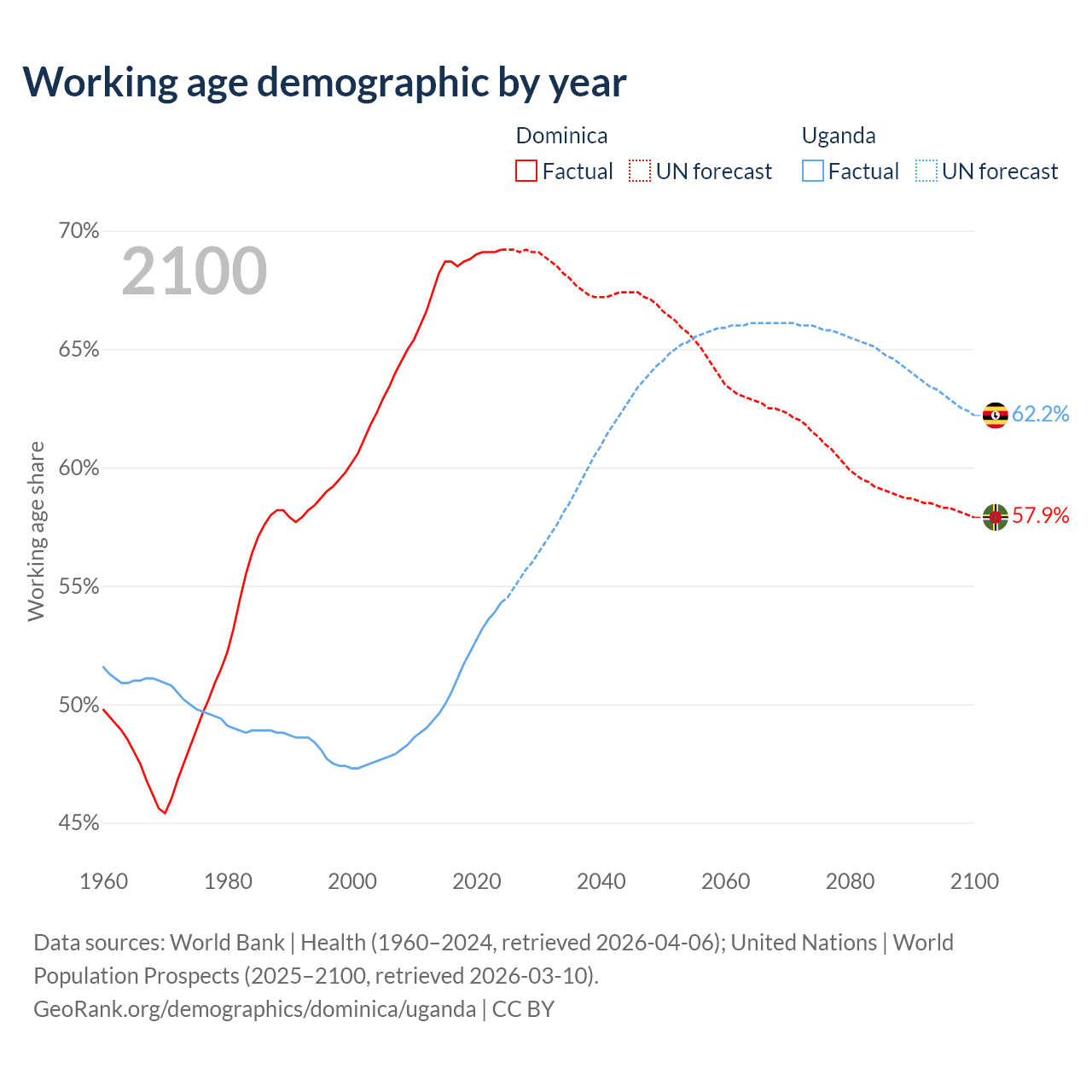 - Dominica has 45.3K working age adults (aged 15-64) vs 28.9M in Uganda.