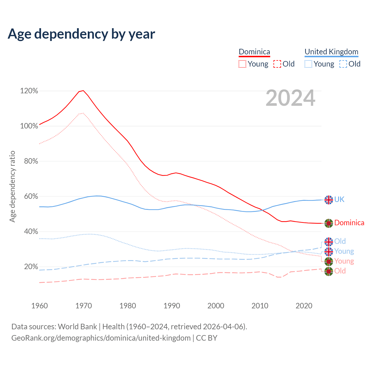 - The median age in Dominica is 37 years compared to 41 years in the United Kingdom.