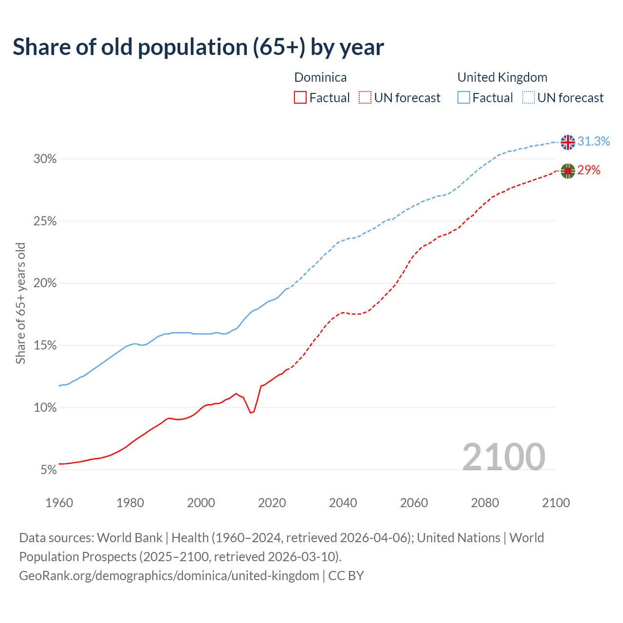 - The share of old-age demographic (65+) in Dominica is 13% vs 19.5% in the United Kingdom.