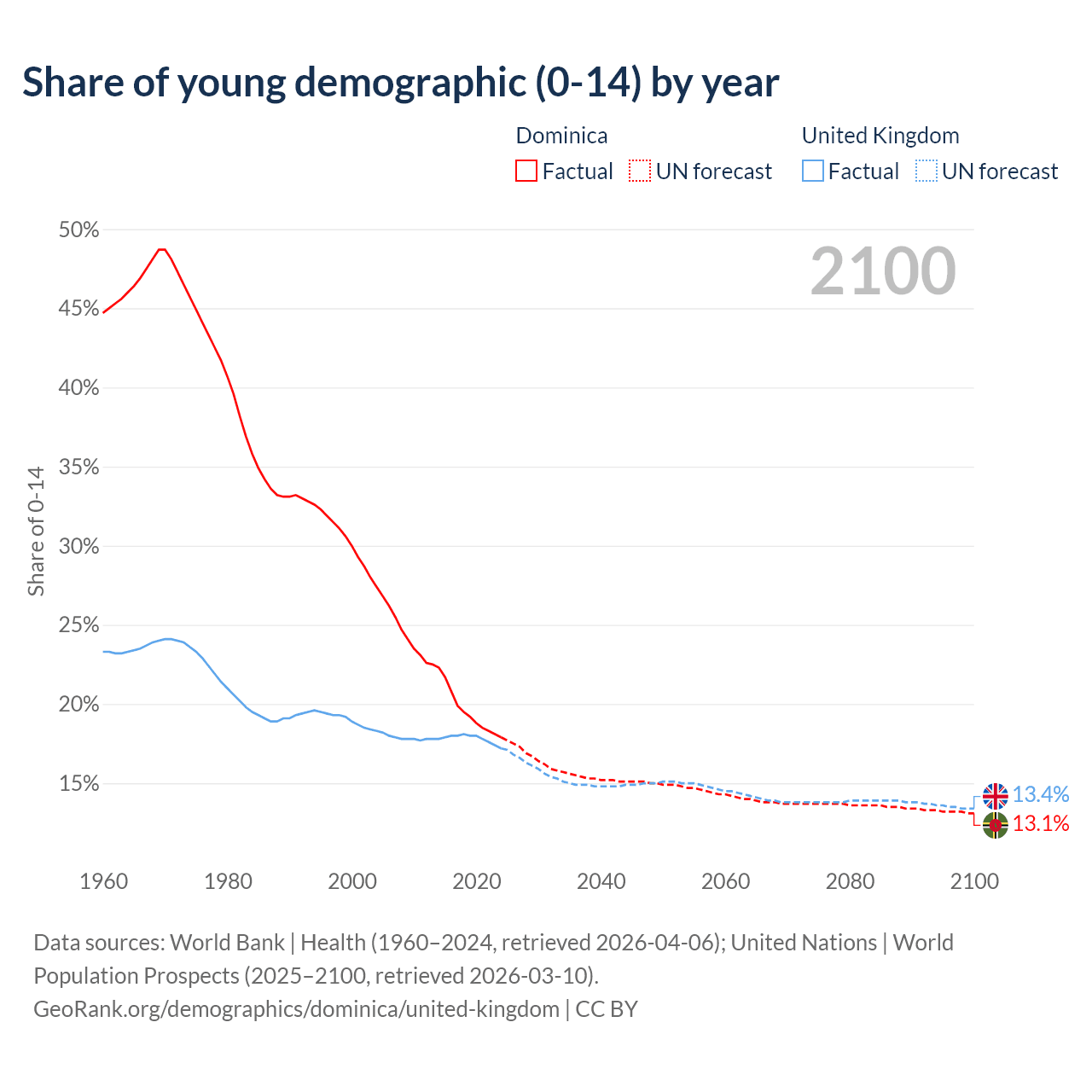 - The share of young demographic (0-15 years old) in Dominica is 17.9% vs 17.2% in the United Kingdom.