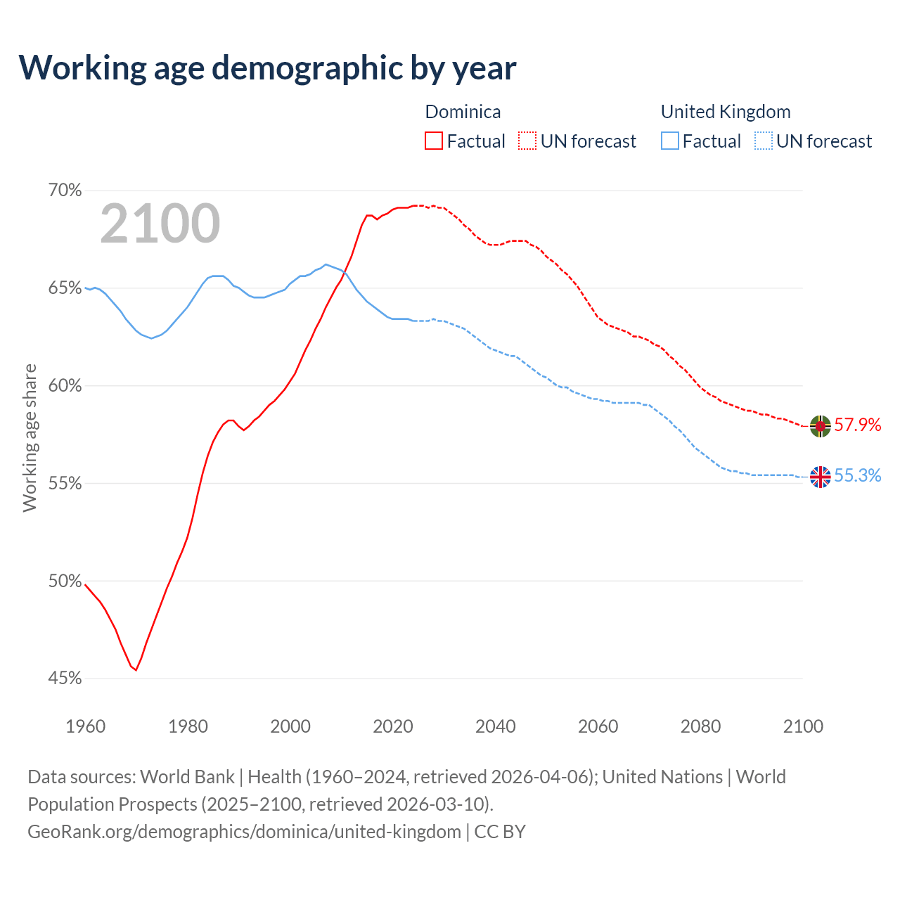 - Dominica has 45.3K working age adults (aged 15-64) vs 44.4M in the United Kingdom.