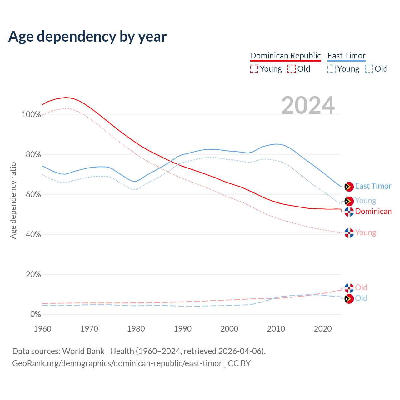 - The share of old-age demographic (65+) in the Dominican Republic is 7.88% vs 5.28% in East Timor.