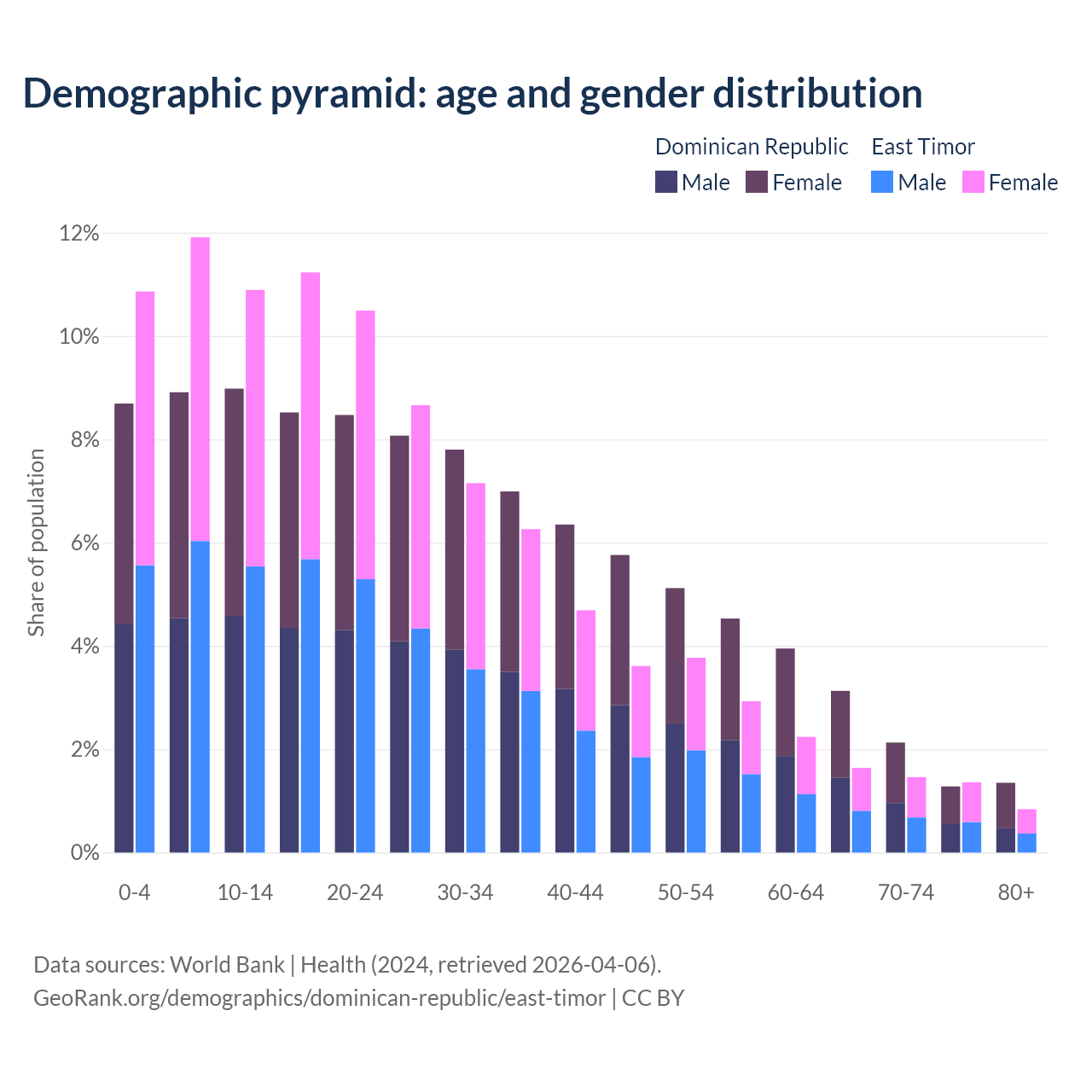 - As of 2026, the population of the Dominican Republic is 11.6M vs 1.44M in East Timor - 8.07 times difference.