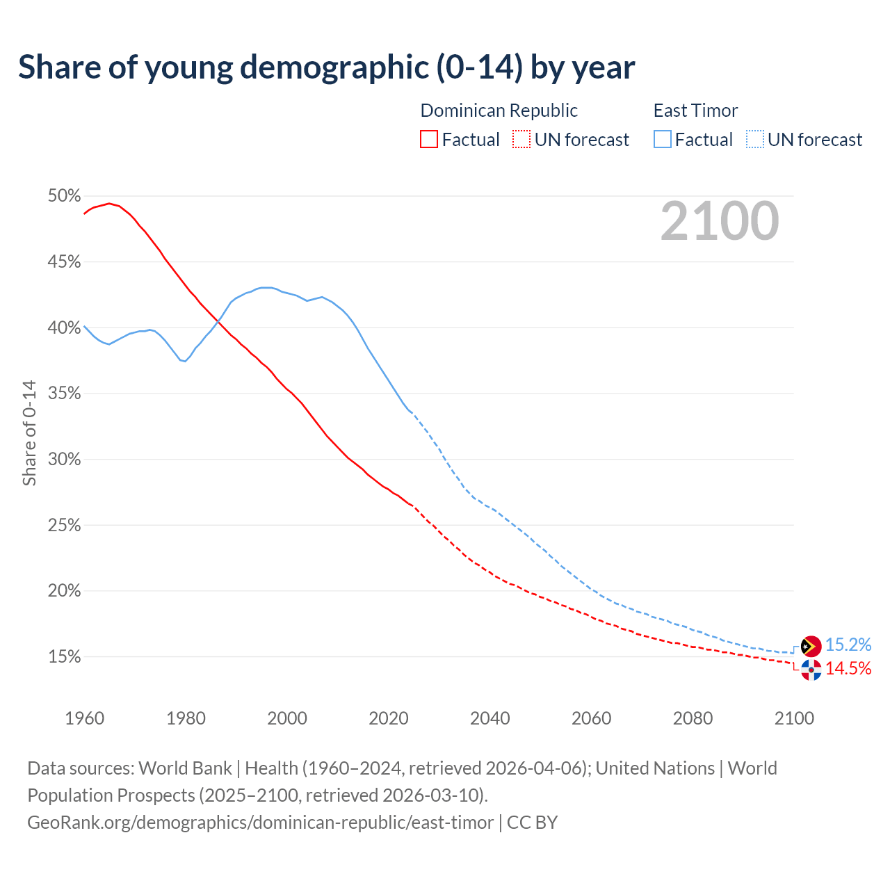 - The share of young demographic (0-15 years old) in the Dominican Republic is 26.6% vs 33.7% in East Timor.