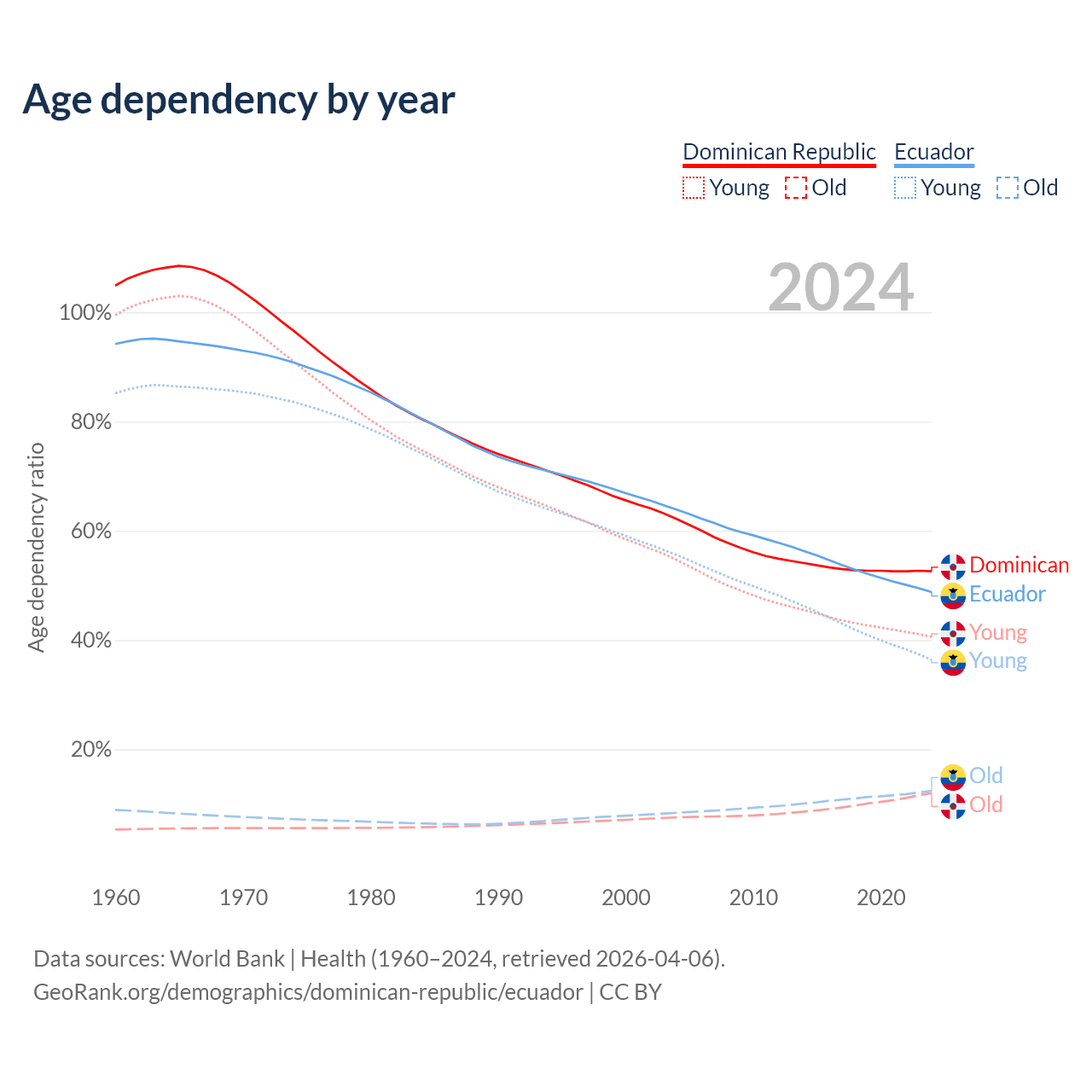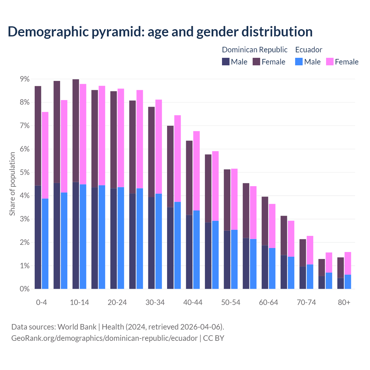 - The Dominican Republic is ranked 112/196 by median age (oldest to youngest) vs 105/196 for Ecuador.