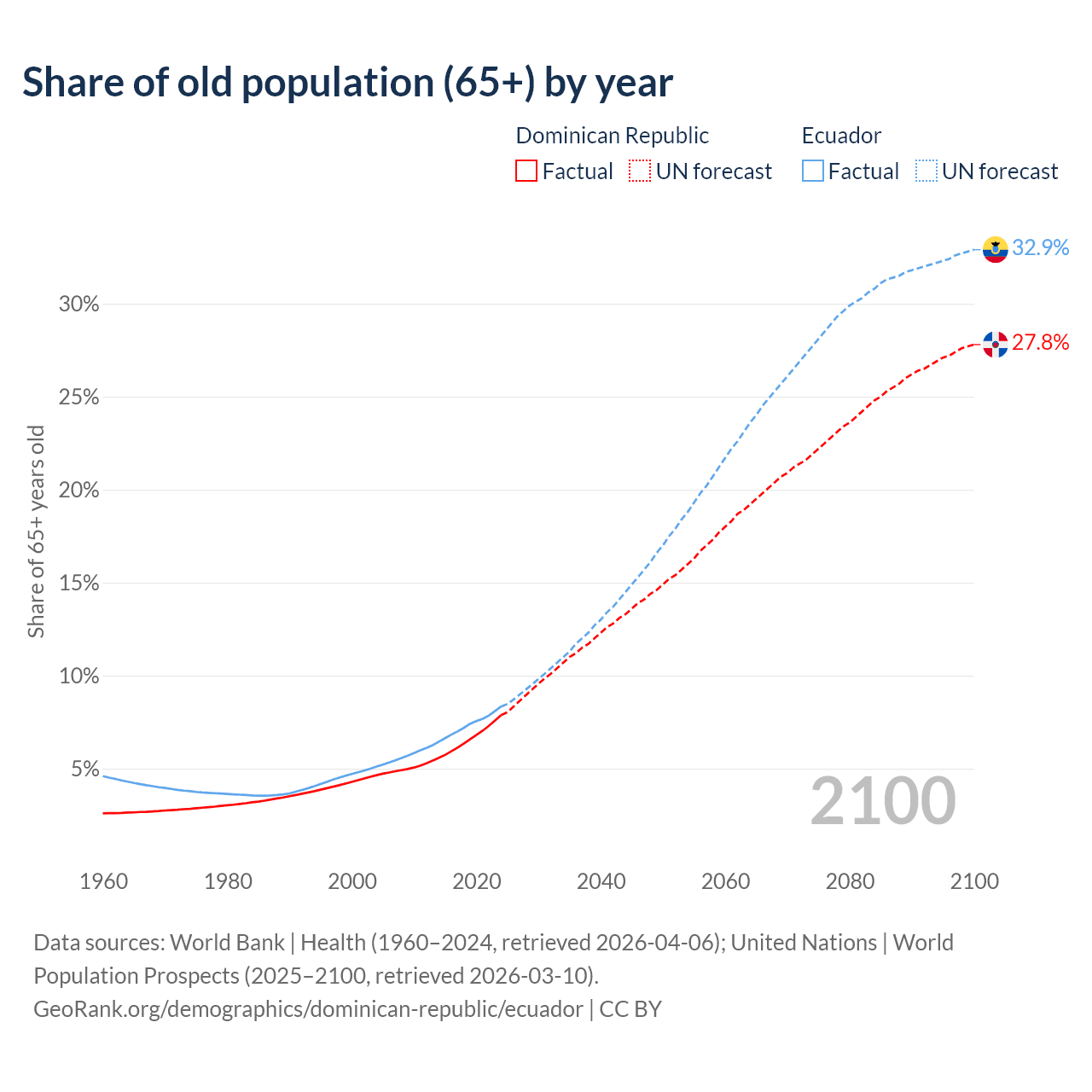 The share of older people aged 65 and over is 7.88% in the Dominican Republic and 8.34% in Ecuador. Life expectancy in the Dominican Republic compared to Ecuador .