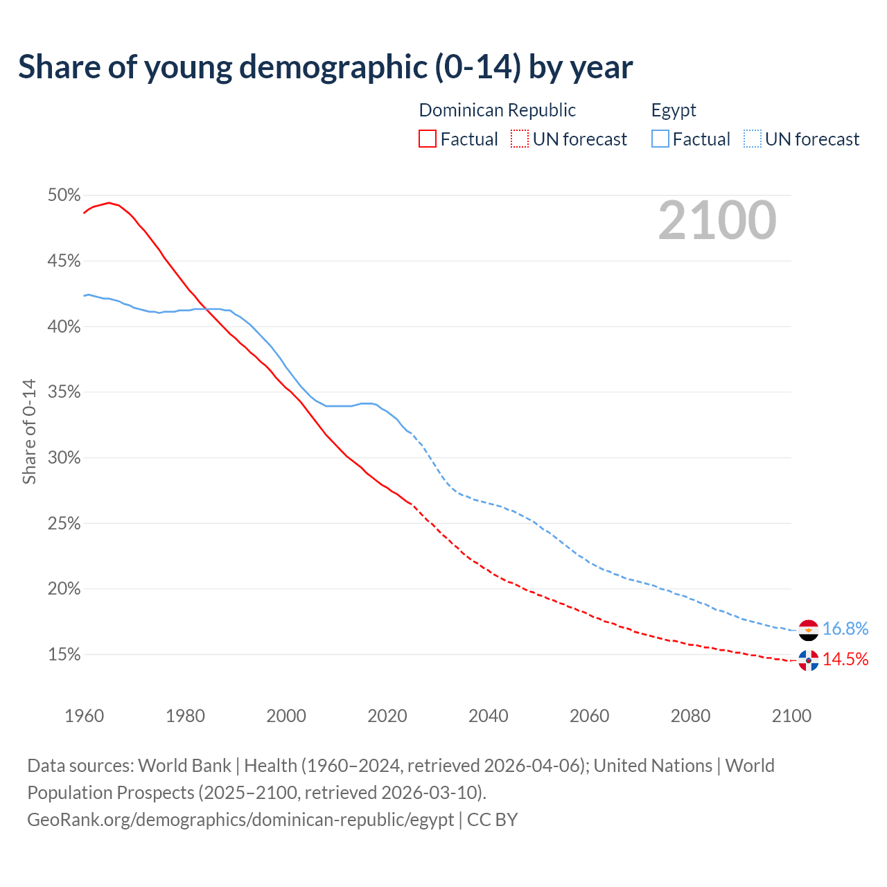 - The share of old-age demographic (65+) in the Dominican Republic is 7.88% vs 5.12% in Egypt.