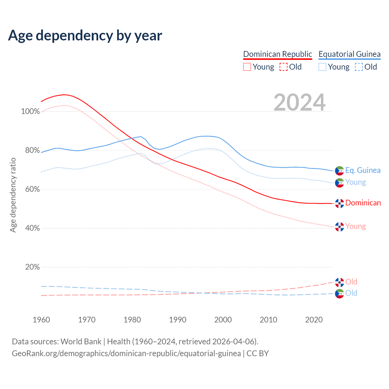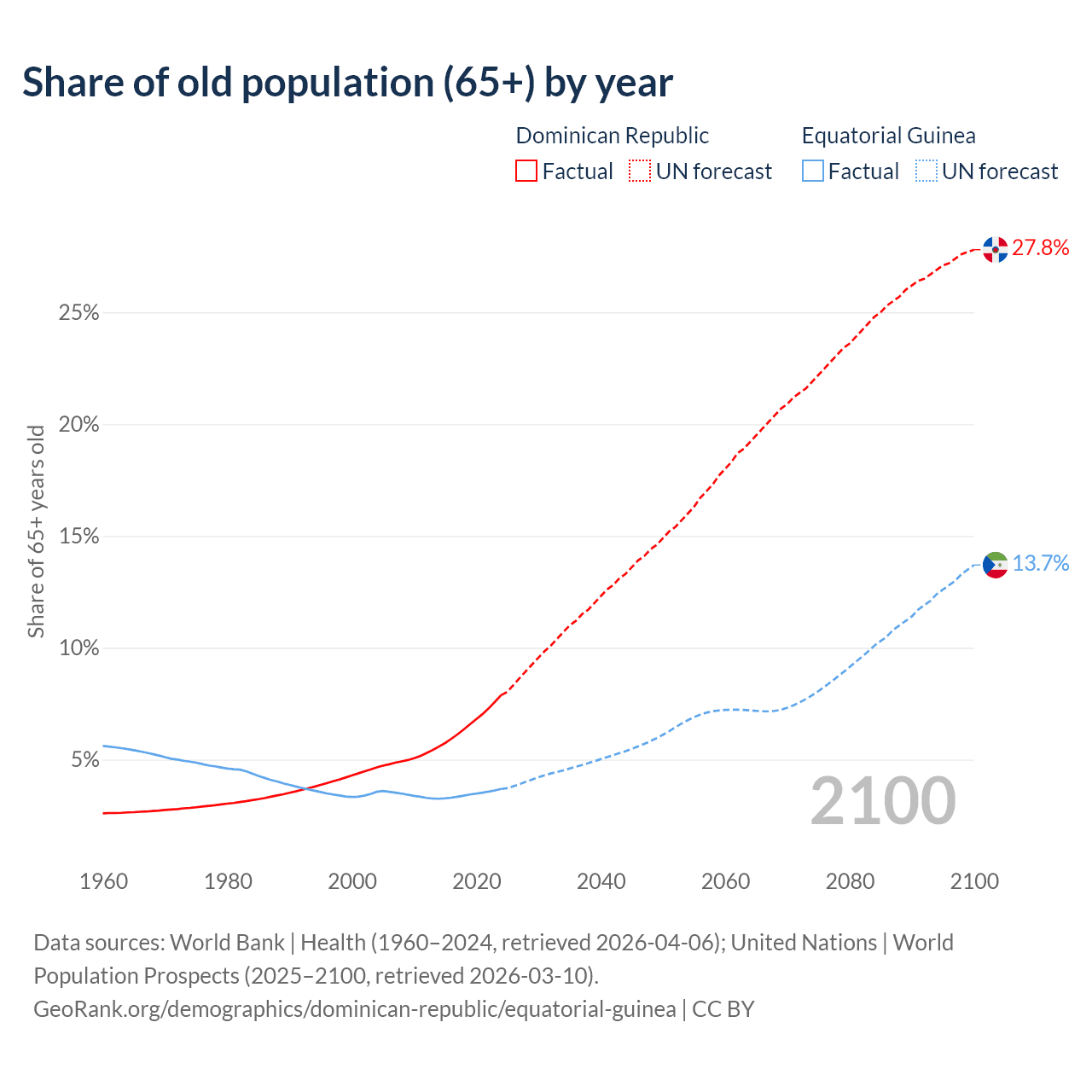 - The share of old-age demographic (65+) in the Dominican Republic is 7.88% vs 3.69% in Equatorial Guinea.