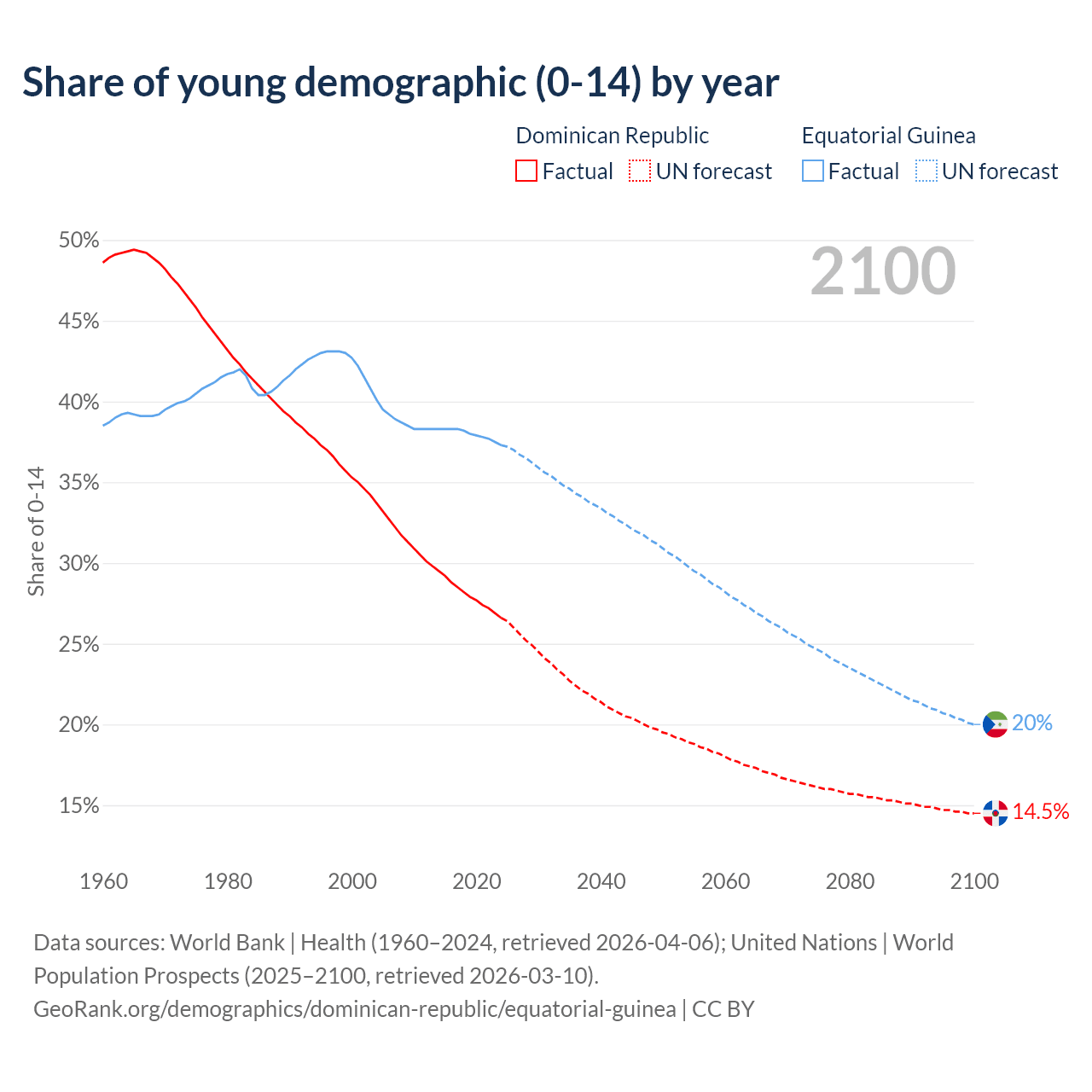 - The share of young demographic (0-15 years old) in the Dominican Republic is 26.6% vs 37.3% in Equatorial Guinea.