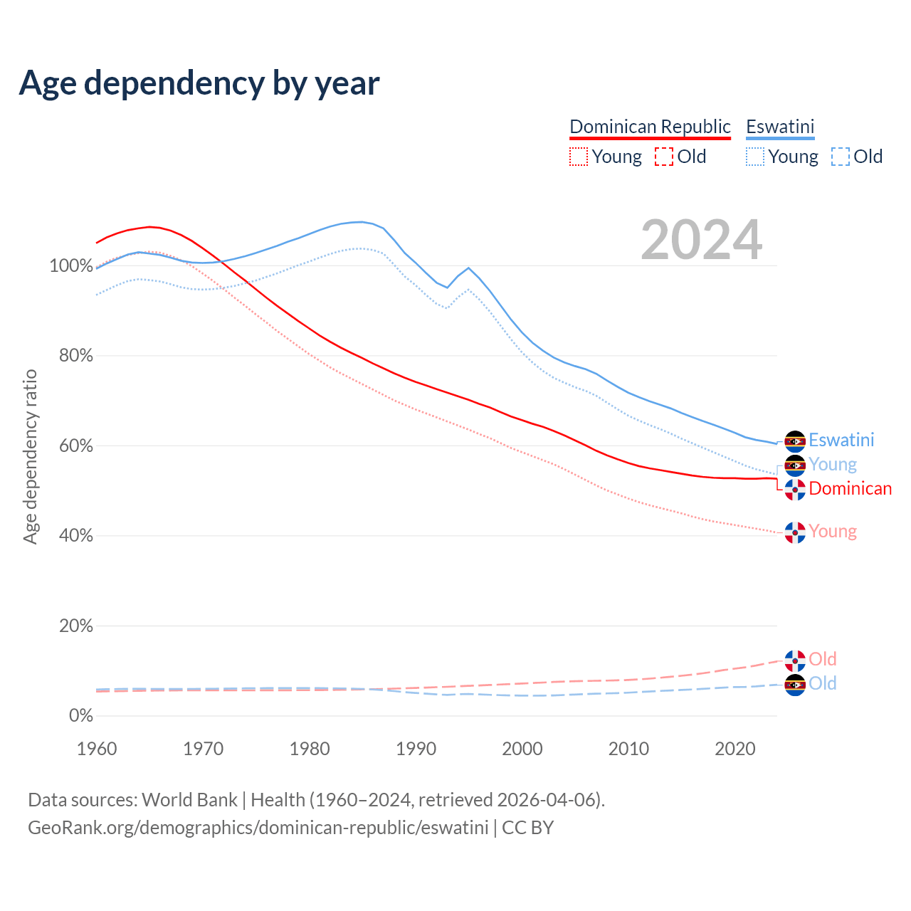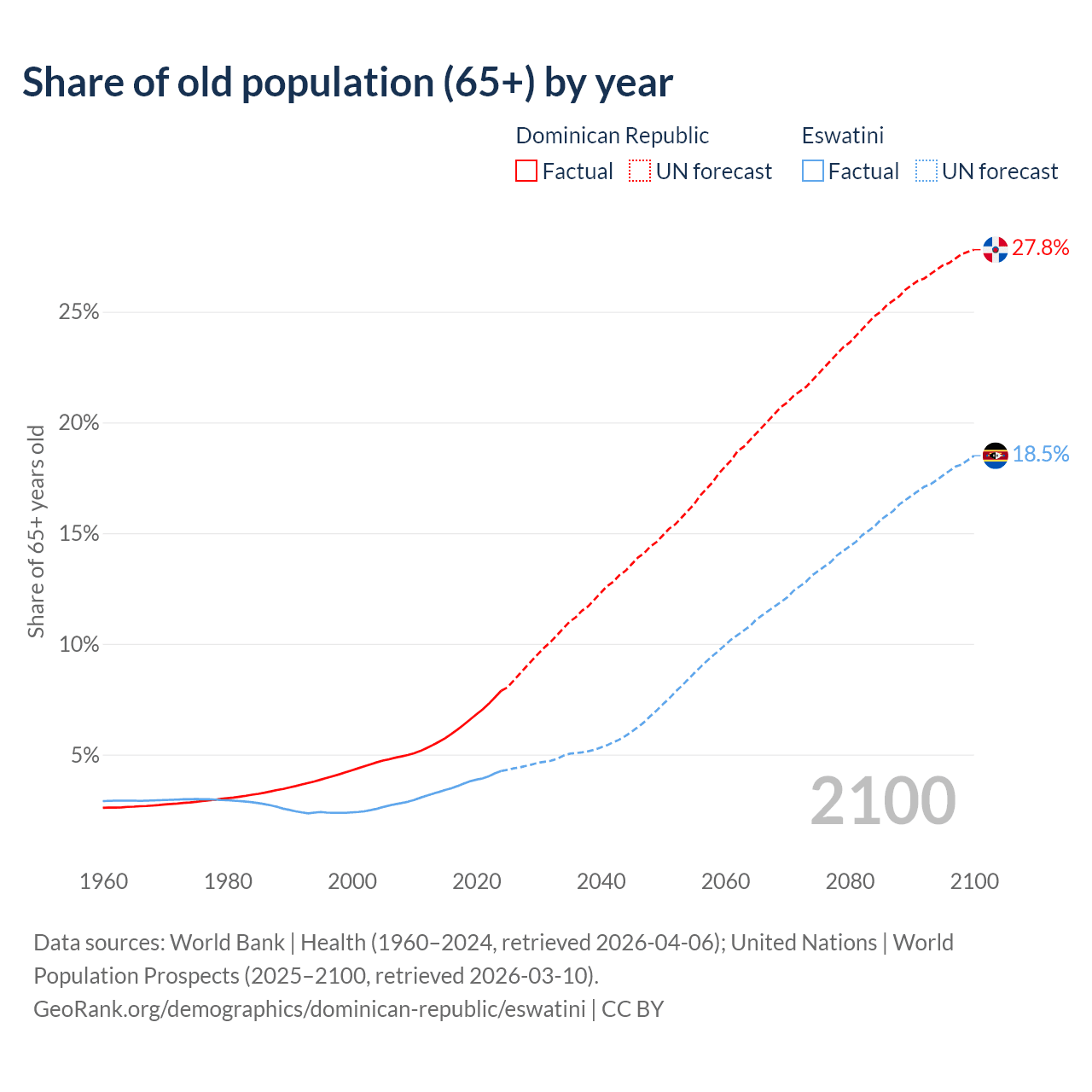 - The share of old-age demographic (65+) in the Dominican Republic is 7.88% vs 4.26% in Eswatini.