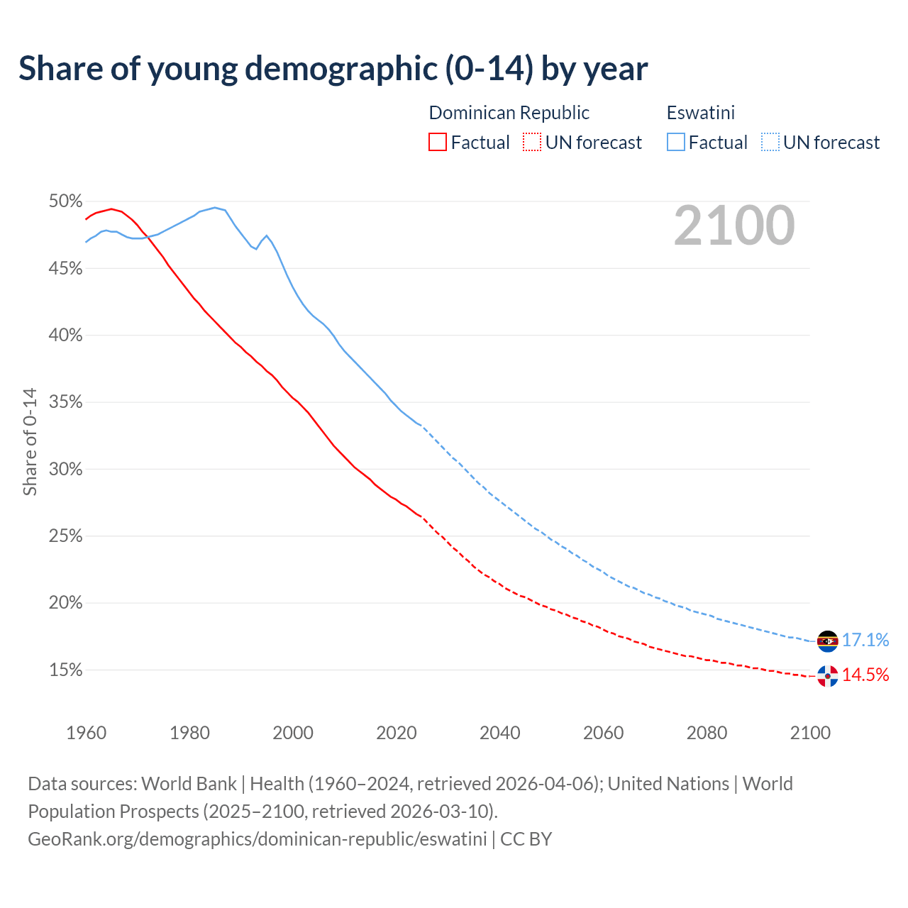 - The share of young demographic (0-15 years old) in the Dominican Republic is 26.6% vs 33.4% in Eswatini.