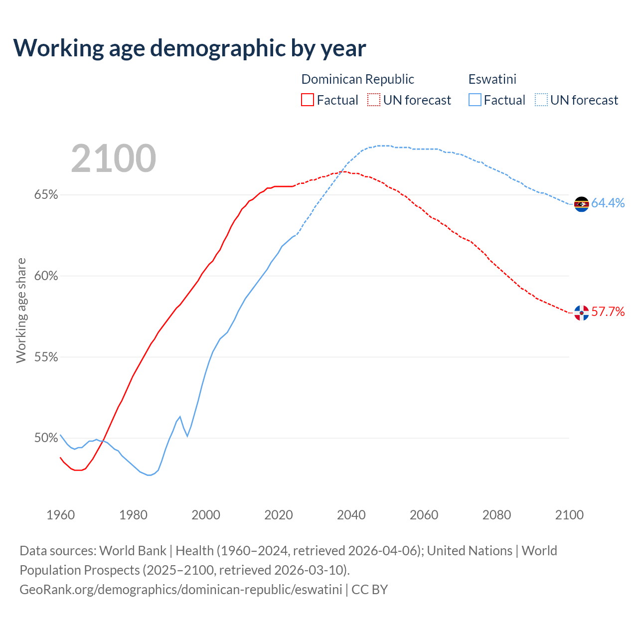 - The Dominican Republic has 7.63M working age adults (aged 15-64) vs 794K in Eswatini.