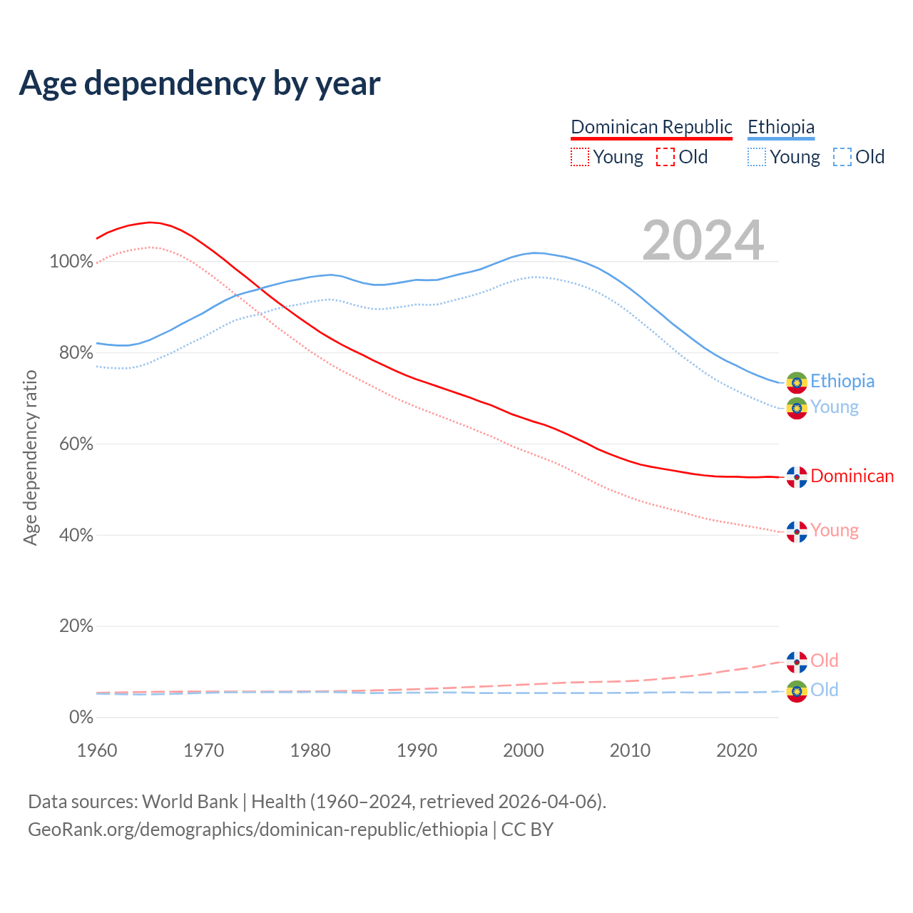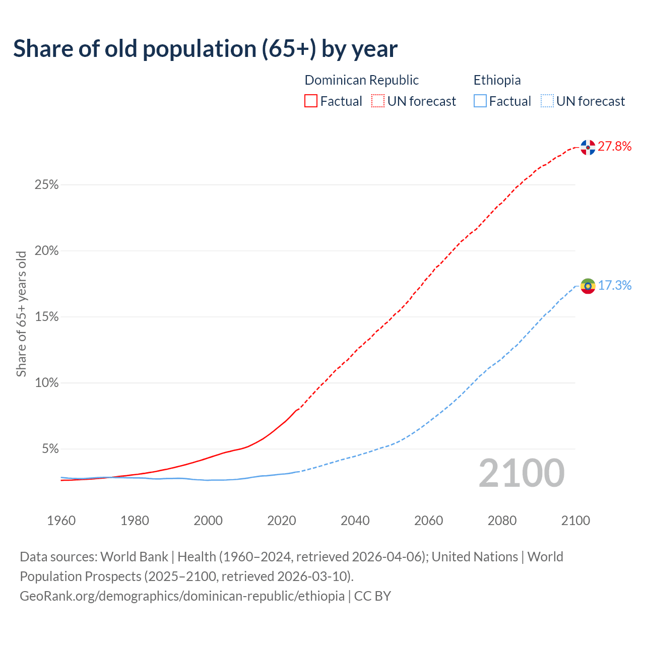 - The share of old-age demographic (65+) in the Dominican Republic is 7.88% vs 3.23% in Ethiopia.
