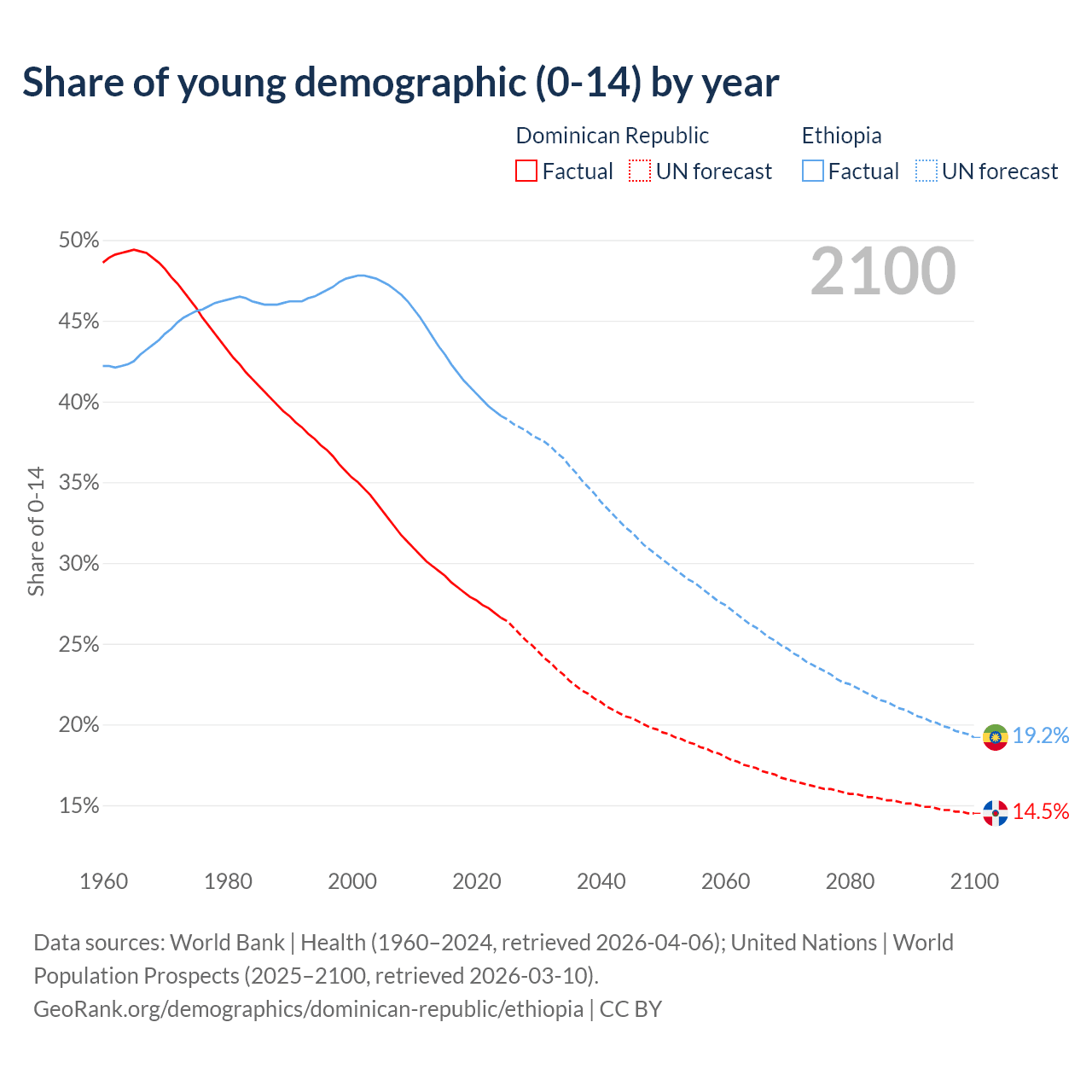 - As of 2026, the population of the Dominican Republic is 11.6M vs 140M in Ethiopia - 12 times difference.