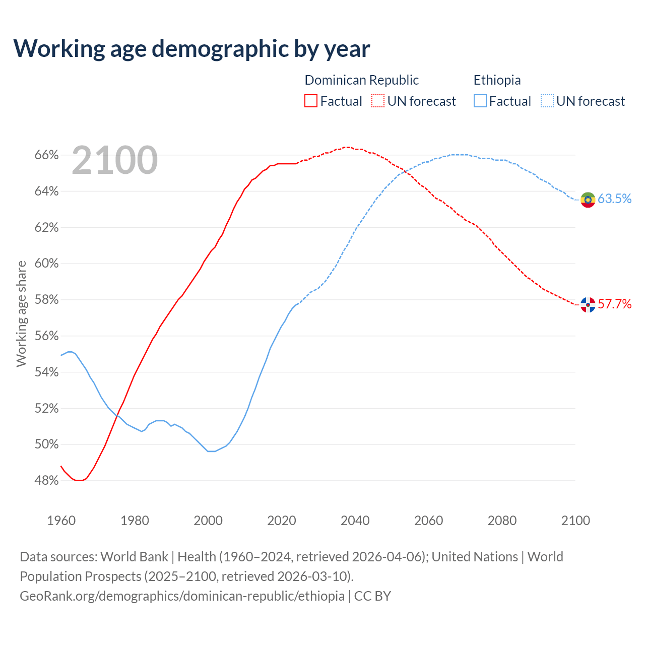 - The Dominican Republic has 7.63M working age adults (aged 15-64) vs 80.7M in Ethiopia.