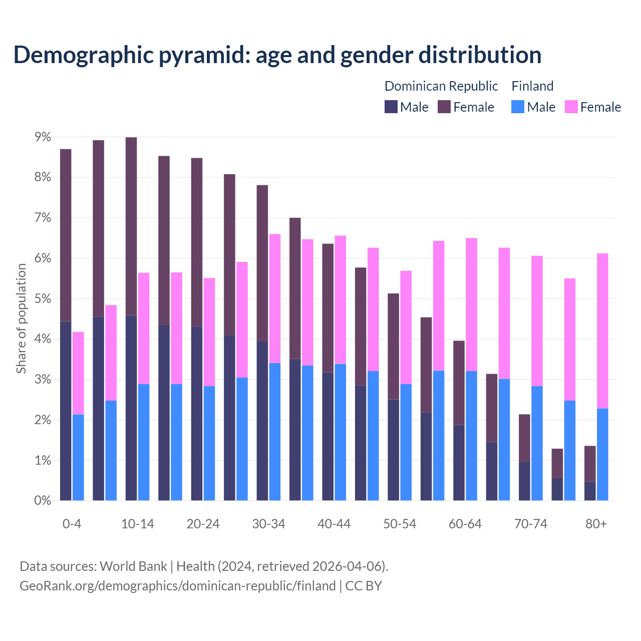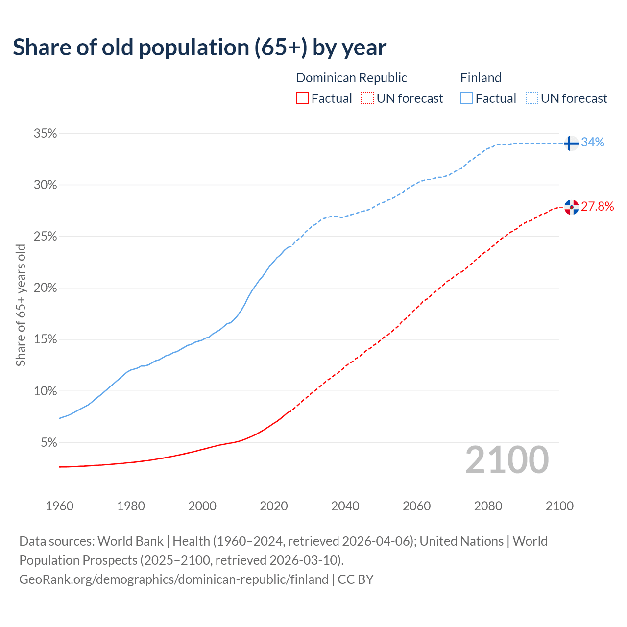 The share of older people aged 65 and over is 7.88% in the Dominican Republic and 23.9% in Finland. Life expectancy in the Dominican Republic compared to Finland .
