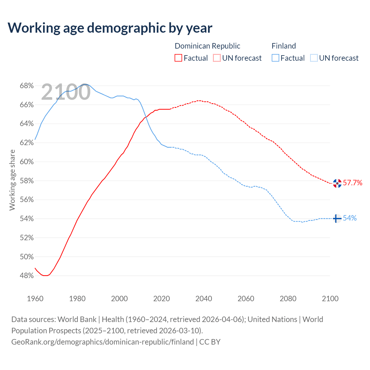 Median age Dominican Republic vs Finland, 1960-2100
