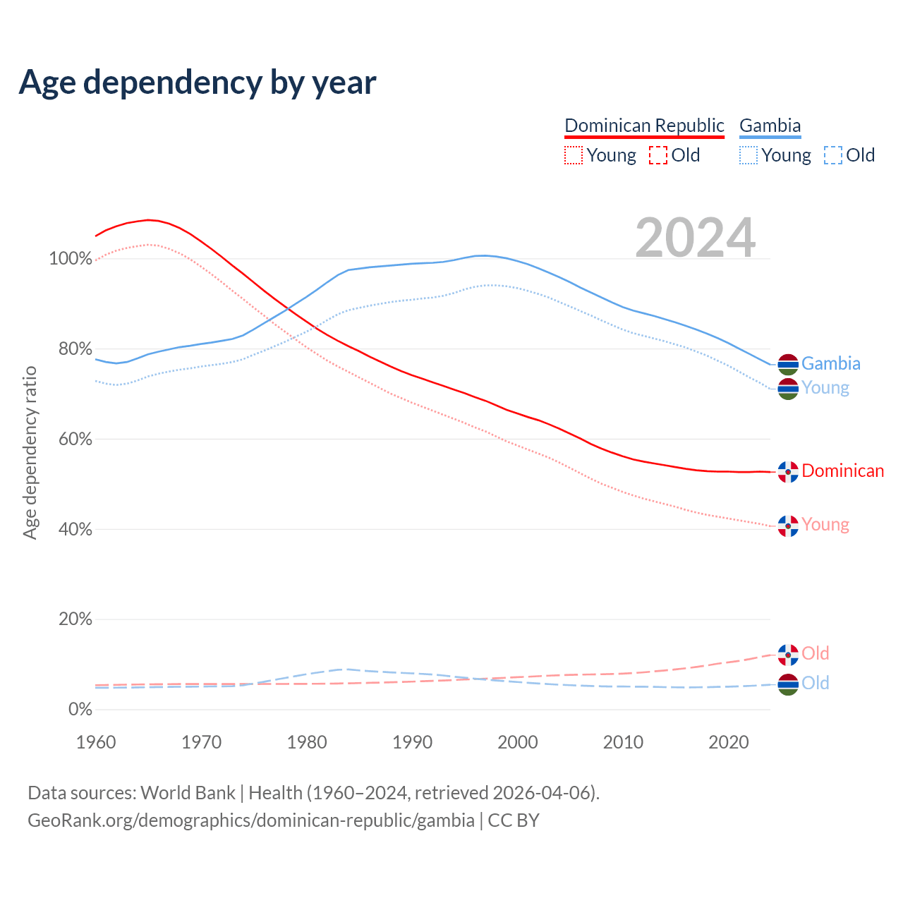 - The share of old-age demographic (65+) in the Dominican Republic is 7.88% vs 3.08% in the Gambia.