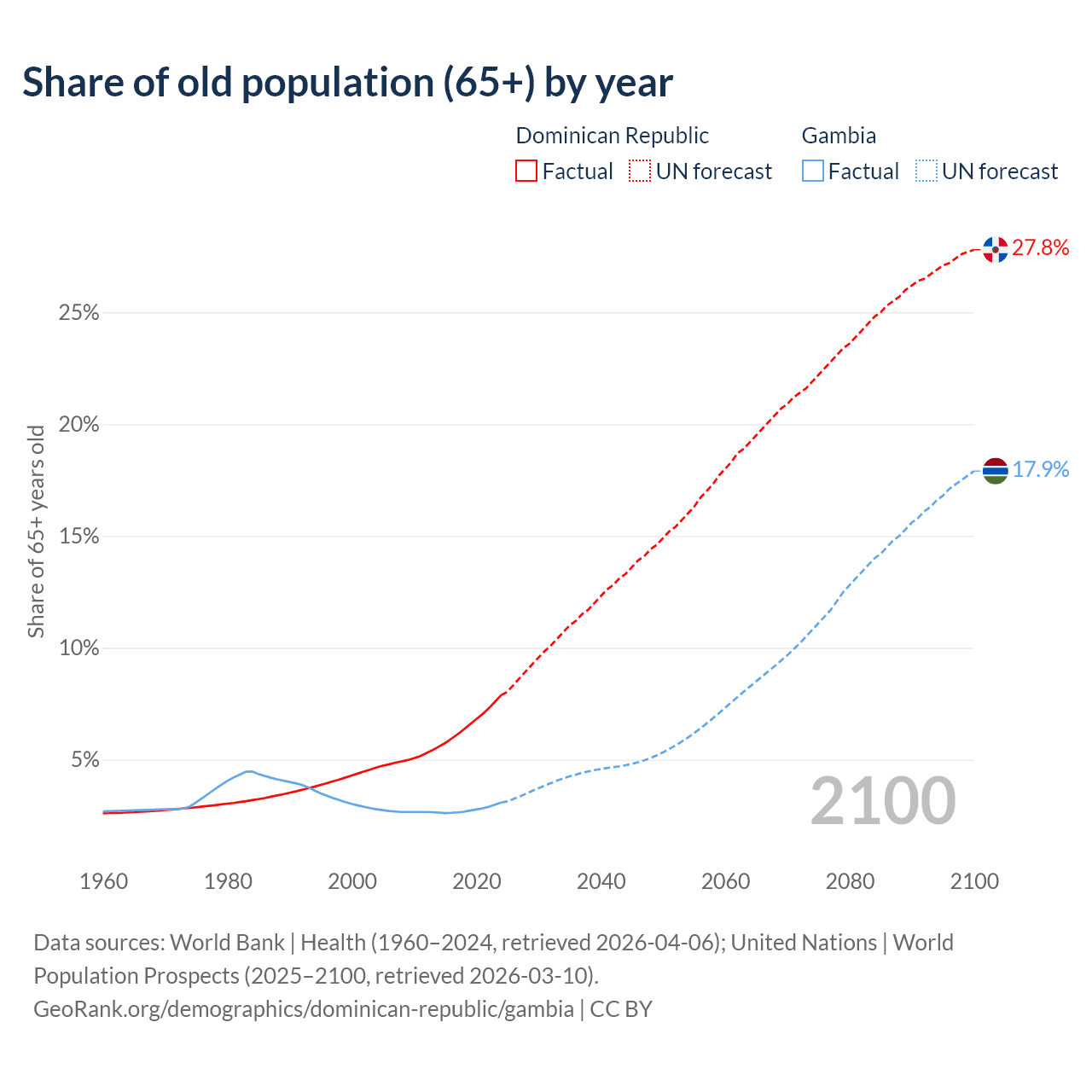 The share of older people aged 65 and over is 7.88% in the Dominican Republic and 3.08% in the Gambia. Life expectancy in the Dominican Republic compared to the Gambia .